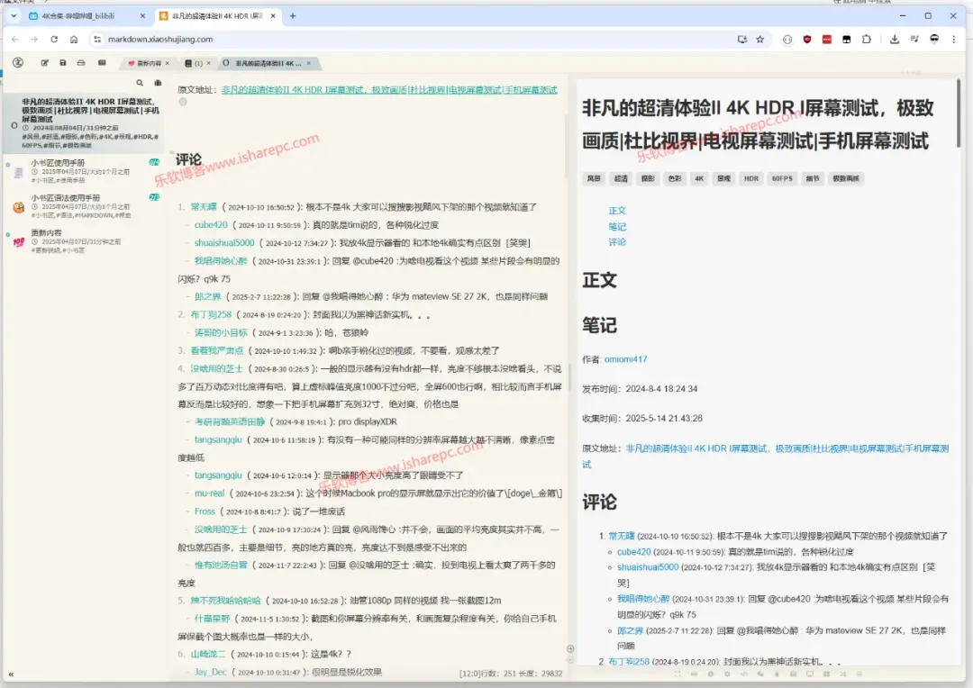 当用户点击收集按钮后,插件会迅速自动跳转至小书匠的markdown网站。随后,它能够一键抓取当前视频的「数据档案」,涵盖范围广泛,包括视频的基本信息、详细的正文内容、用户自行记录的笔记,以及评论区中热度较高的热评等。这些信息被系统化地打包呈现,为用户打造了一份视频内容的「数字手账」,方便用户对视频信息进行整理和回顾。