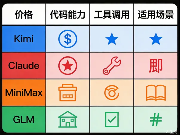 接下来我们用“人话”来分析Kimi、Claude、MiniMax、GLM四大AI的工具调用能力,包括它们的特点、能力边界和最适合的场景。