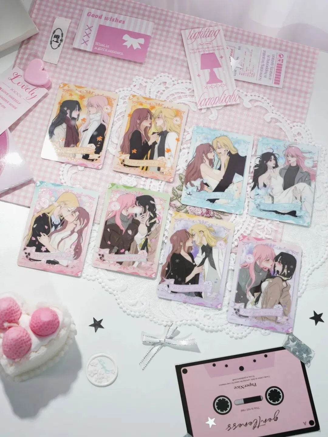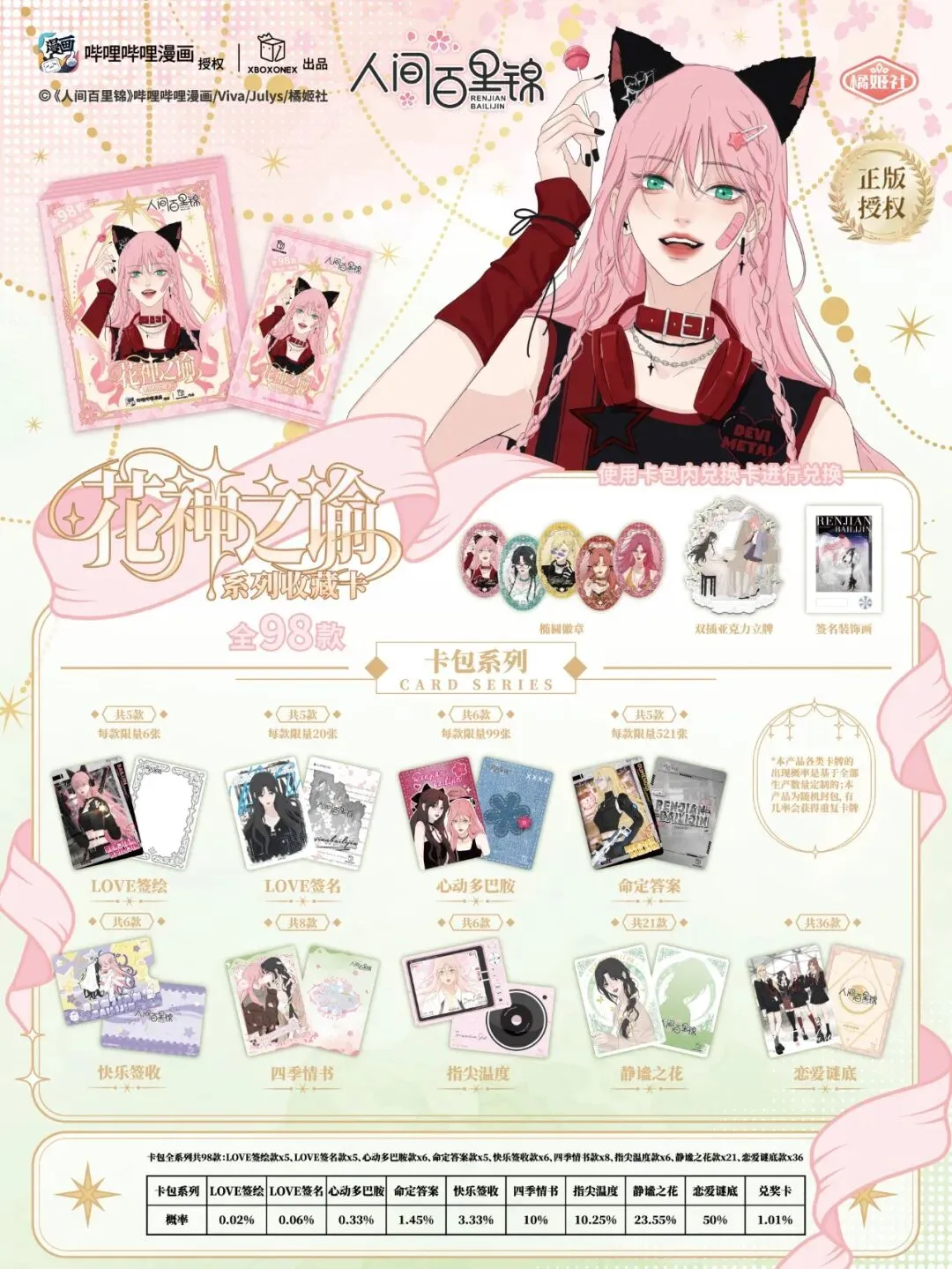 上新公告 | 《人间百里锦》漫画花神之谕系列收藏卡盲盒 🖌花神谕笔,独韵臻藏!Julys&Viva 专属 LOVE 签绘卡 30 张限量臻造,每一张卡都独一无二~内含生日编号藏珍意:林慕溪、顾梦奇、秦不疑各有1张生日编号🎨独家新图,叙事成篇!CP 互动凝四季情书,单人多造型绘静谧繁花,98 款卡面织就人间百里的浪漫长卷📜折光雕刻机能飒影、温感显影心动场景、抽拉印签藏惊喜、镭射解恋爱谜题,98 款卡面九大卡位,每一款都是视觉与互动的双重盛宴💫花笺解谜,爱意作答!恋爱谜底卡用素面镭射工艺铺展浪漫,卡背藏尽恋爱答案之书的温柔箴言,一卡一谜皆是心动回响