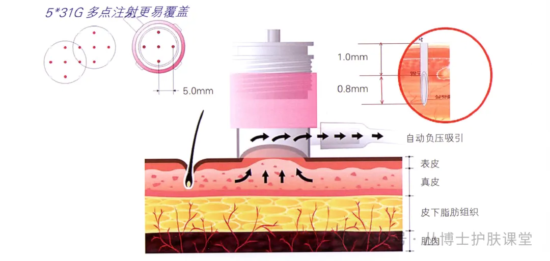 - 狭义定义:特指用该仪器将微量透明质酸注入真皮层,核心作用是补水。