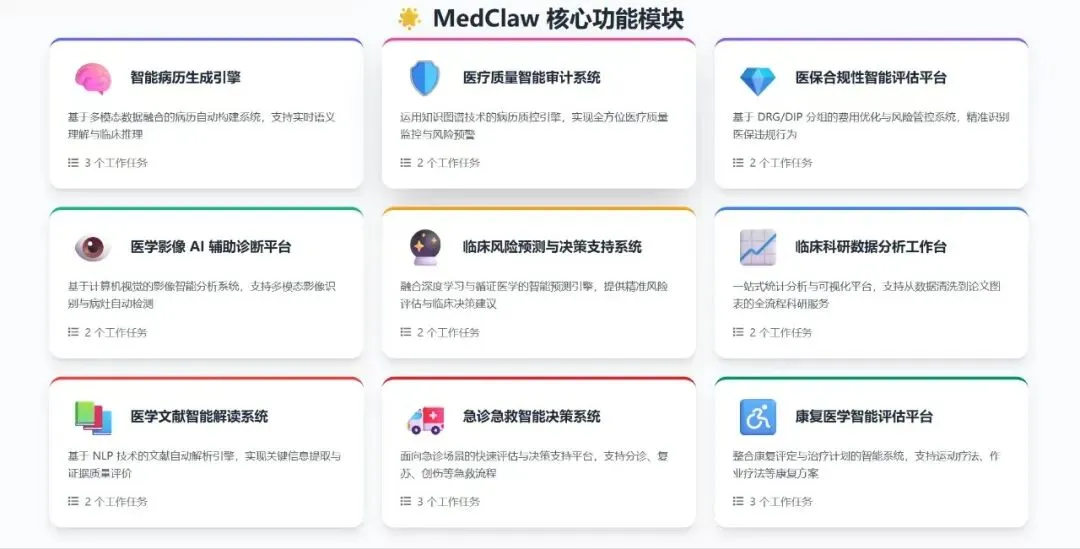 其一,首创9大医疗职业场景全覆盖的标准化任务体系,填补全球医疗AI无全岗位标准化模板的空白。MedClaw精准覆盖临床、质控、医保、影像、药学、科研、护理、急诊、康复九大医疗核心职业,提炼21个符合医疗行业规范的标准任务模板,从临床医生的急诊抢救、护士的入院评估,到医保审核员的费用合规检查、科研人员的临床数据提取,每个岗位的核心工作都有可直接调用的标准化流程,这是全球首款真正贴合医疗各岗位真实工作流的智能任务执行系统,彻底改变了海外工具“重行政、轻专业”,国内工具“单一场景、无法通用”的现状。