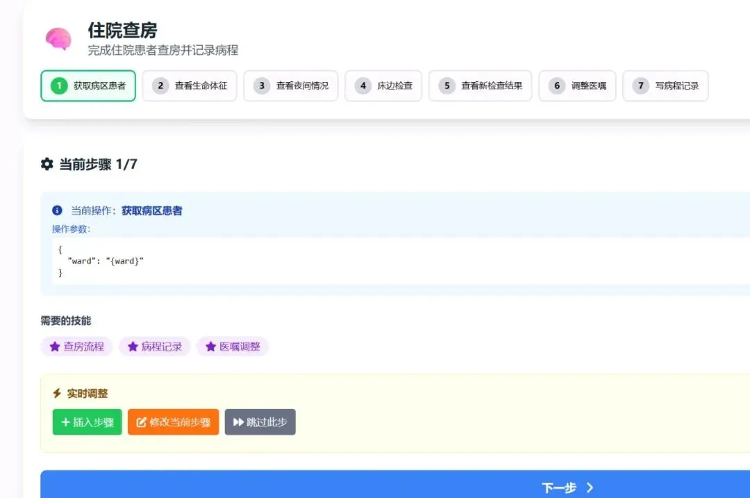 其二,首创医疗任务运行时动态调整机制,让标准化模板适配个性化医疗场景。医疗工作的特殊性在于,标准化流程下仍需根据患者情况、工作需求灵活调整,MedClaw首次实现医疗任务步骤的跳过、插入、修改全维度动态操作,无需重构代码,即可在运行时调整任务流程,比如临床接诊中可跳过非必要检查步骤、康复评估中插入专项检查环节,让标准化模板不再是僵化的流程,而是能适配各类个性化医疗场景的灵活框架,这一设计远超海外工具的固定自动化流程,真正贴合医疗工作的实际需求。
