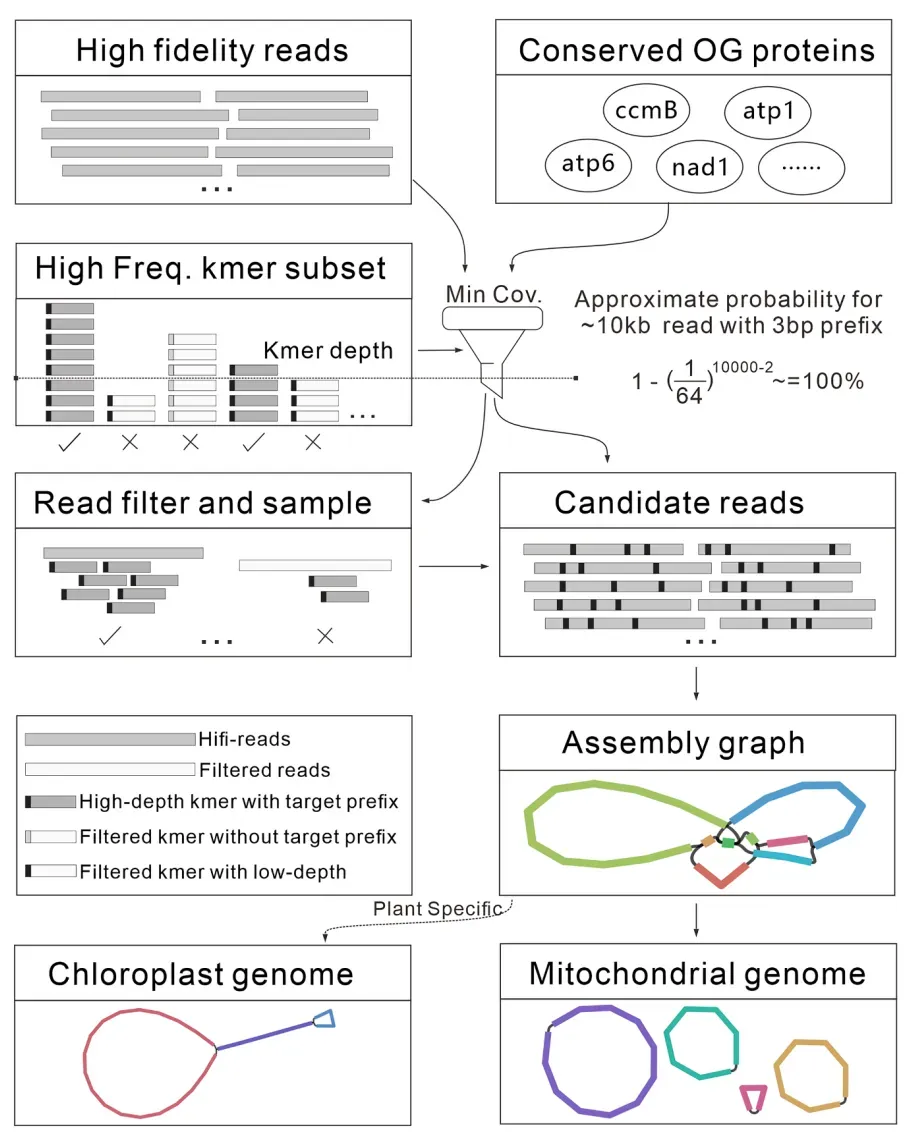 利用 HiFi 读段与保守细胞器蛋白序列自动确定含 3-bp 前缀的高频 k-mer 阈值,识别候选读段后分别组装叶绿体与线粒体基因组。