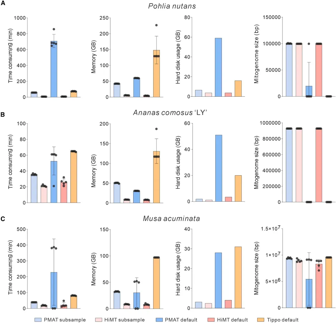 选取黄丝瓜藓(~100 kb)、凤梨(~1 Mb)及小果野蕉(>10 Mb)三类代表性数据集,比较 HiMT、PMAT、TIPPo在默认与采样模式下的资源消耗,说明HiMT在笔记本级别硬件上的高效性与实用性