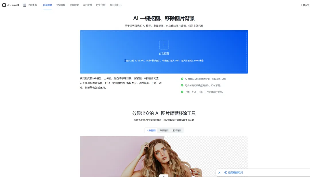 docsmall是一个在线批量抠图工具,主要有AI一键抠图、背景移除工具,可以自动将图片背景移除,存储为PNG格式