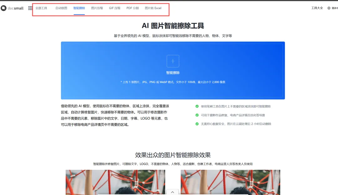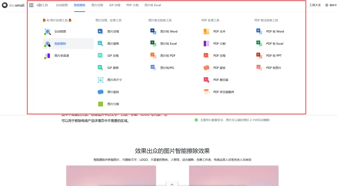 提供自动抠图,智能擦除,图片压缩,GIF压缩,PDF分割,图片转Excel