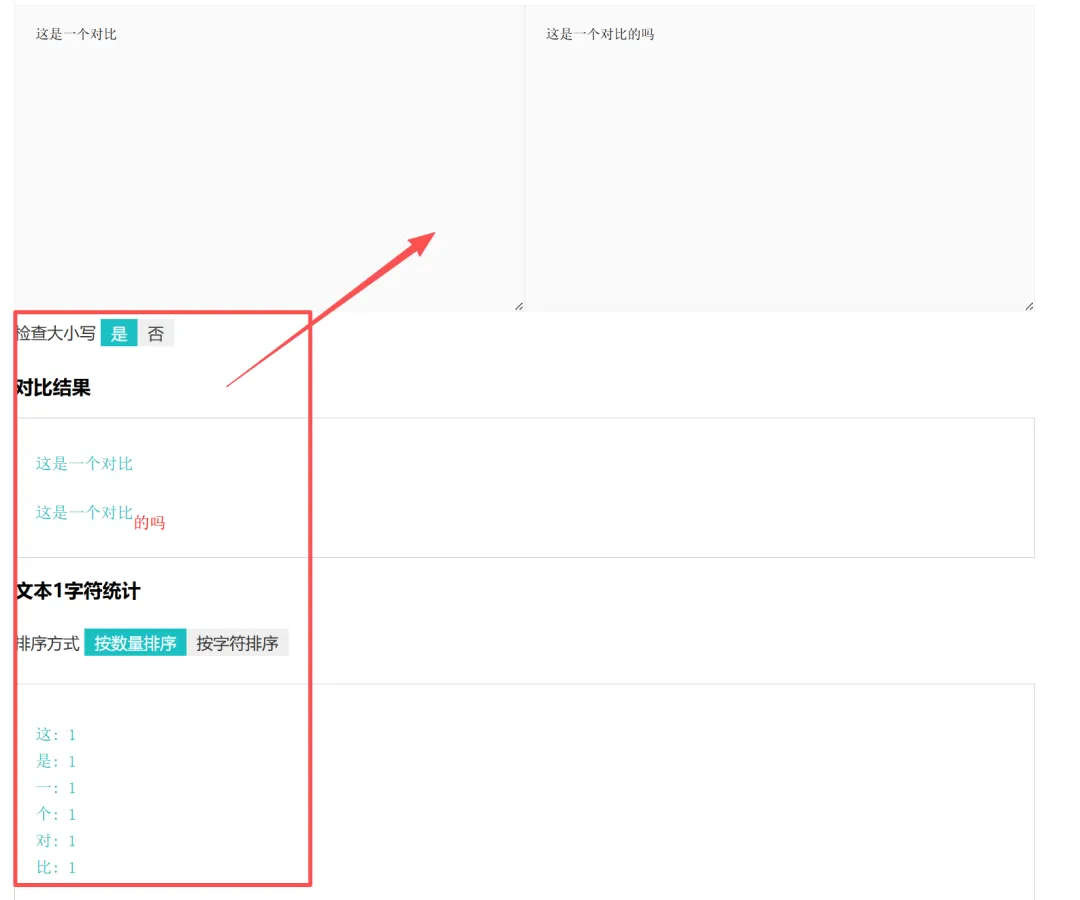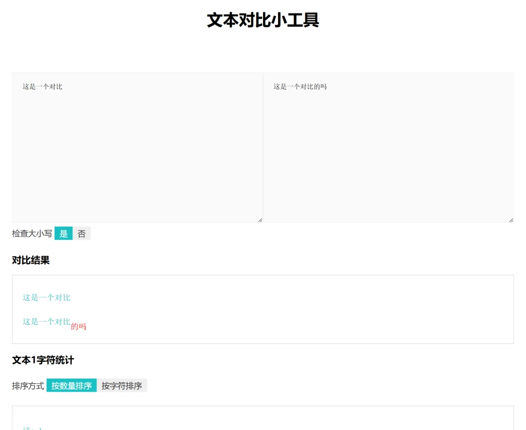 在线文本对比工具是一个在线文本对比工具,操作简单,无需注册即可使用,可以快速比对两段文本之间存在的差异,支持检查大小写敏感度并统计字符信息