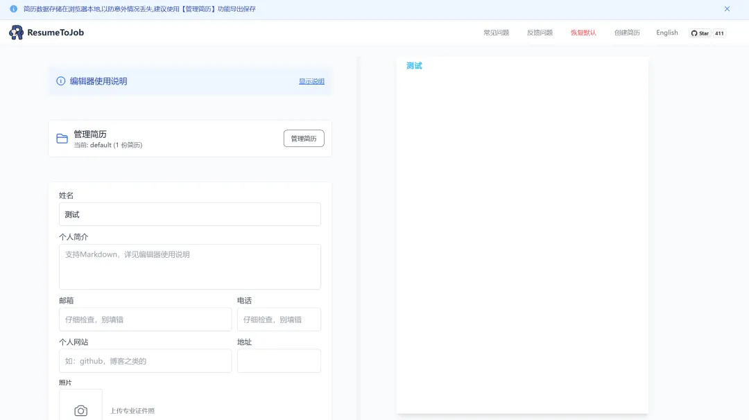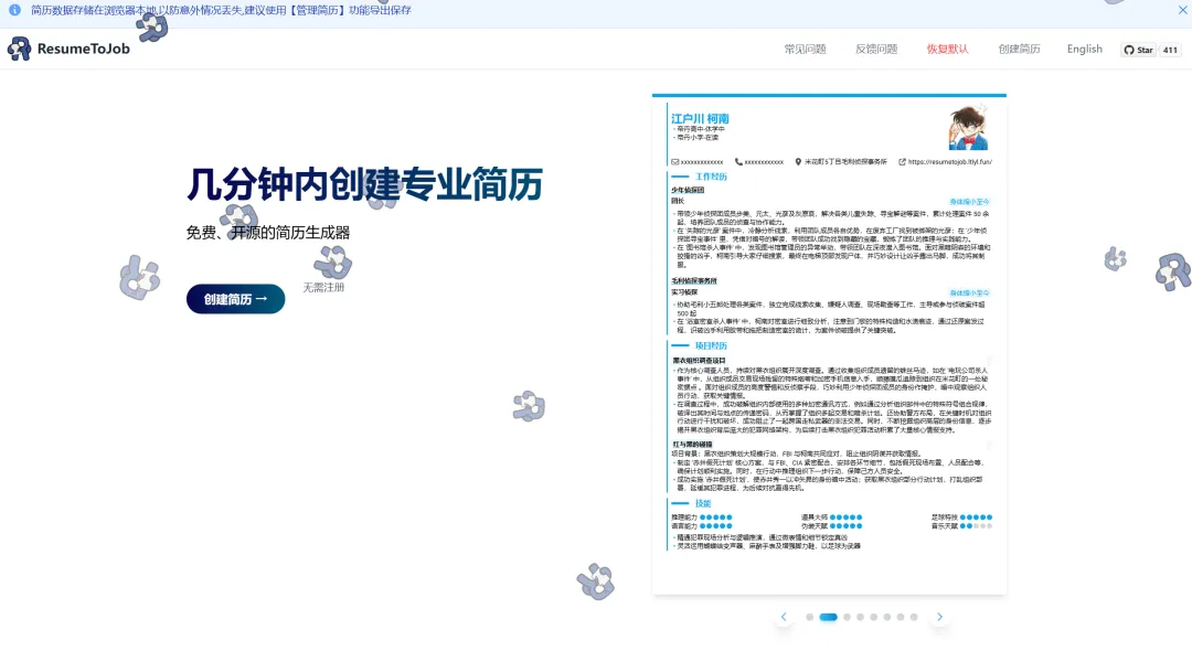 简历制作是一个免费的简历生成器,无需注册即可使用,操作简单,只需几步即可生成一份专业的简历