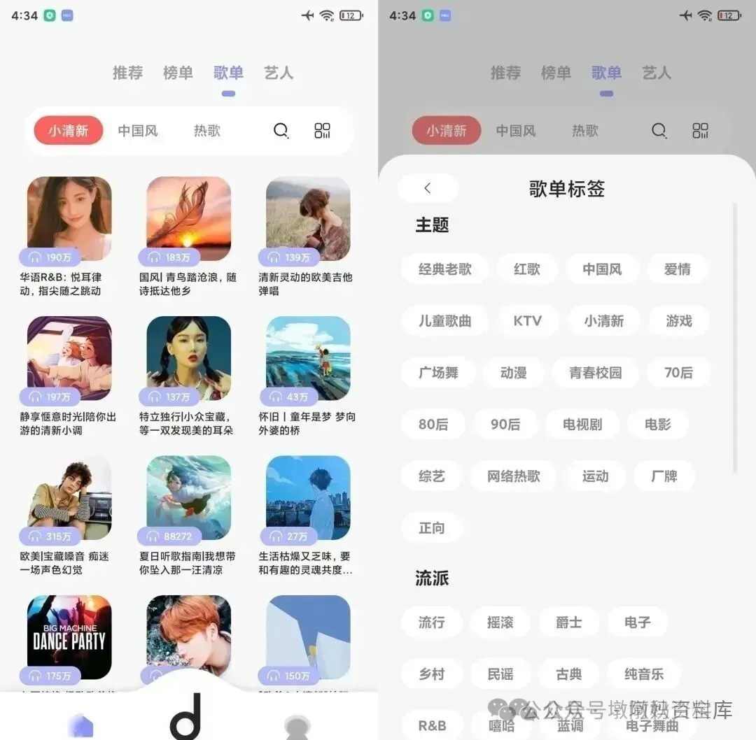 榜单板块涵盖新歌榜、热歌榜等多类榜单,每类榜单醒目展示TOP3歌曲,完整歌曲列表均含50首曲目,满足不同听歌需求。歌单页面配备丰富分类标签,华语R&B、国风等多样风格歌单一键直达;点击右侧小图标,还能按主题、流派精细化筛选歌单,精准锁定专属风格。