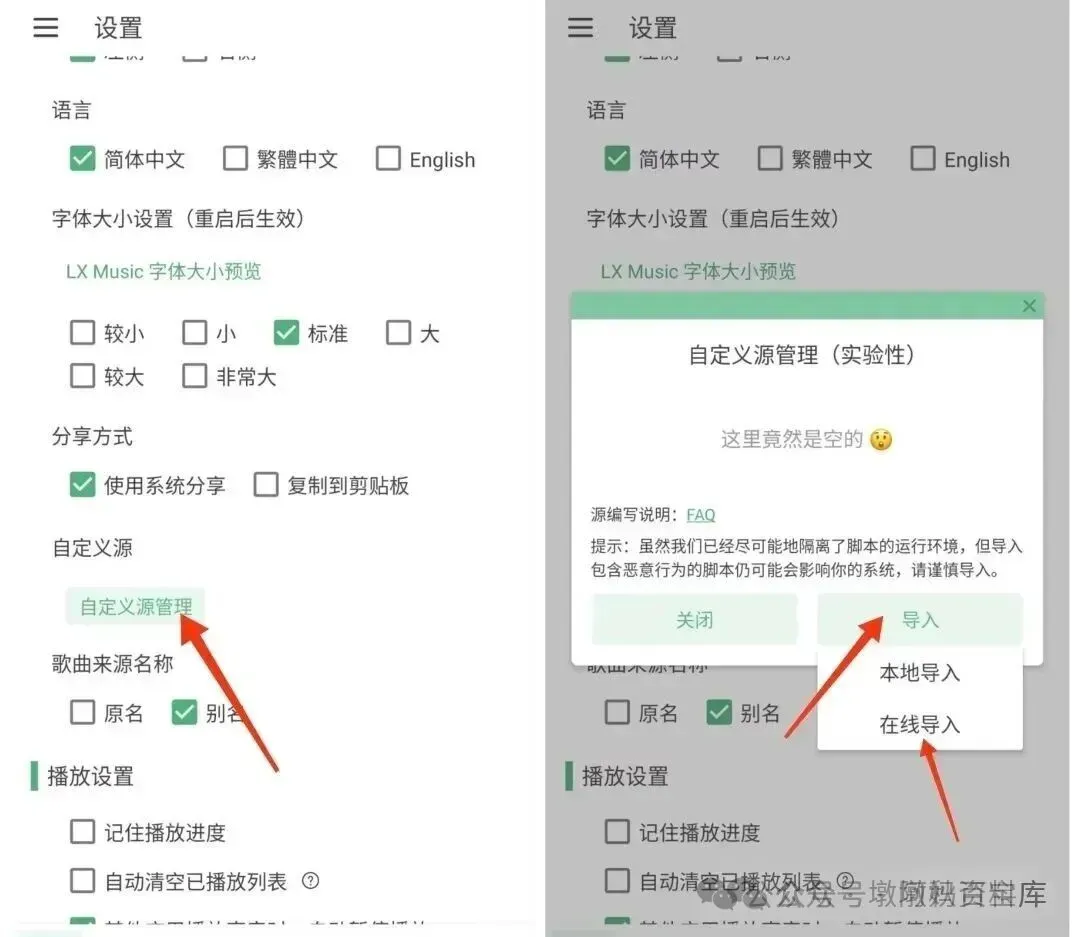 音源导入教程:打开设置找到【自定义源管理】→选择【在线导入】→粘贴音源链接(附专属音源)→导入完成后勾选该音源,显示初始化成功即可正常使用!