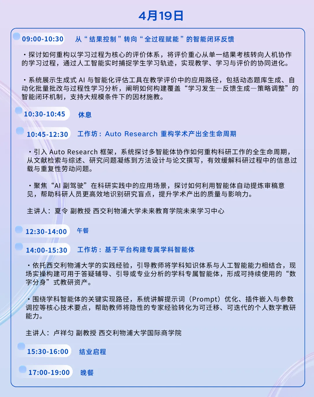 作为中国高等教育改革的探路者,西交利物浦大学早已开始作答。依托西浦1.0、2.0到3.0教育模式的深厚积淀,携手西浦君谋智能体平台,我们将于4月18日至19日推出“iAgent@XJTLU:智能体驱动的教学与科研工作流重构研修” 。