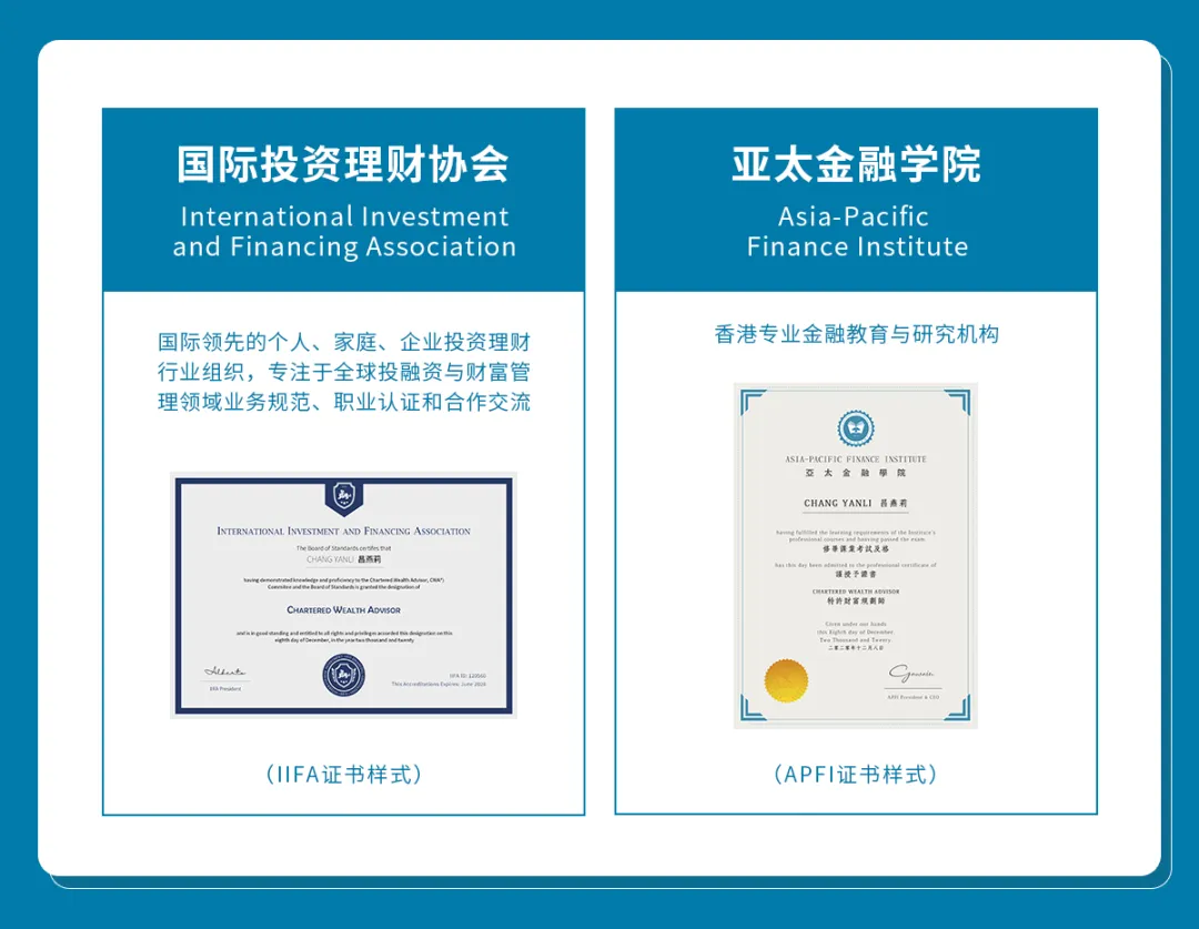 通过认证考试后,即可同时获得由IIFA颁发的职业证书,以及由香港APFI颁发的专业证书。