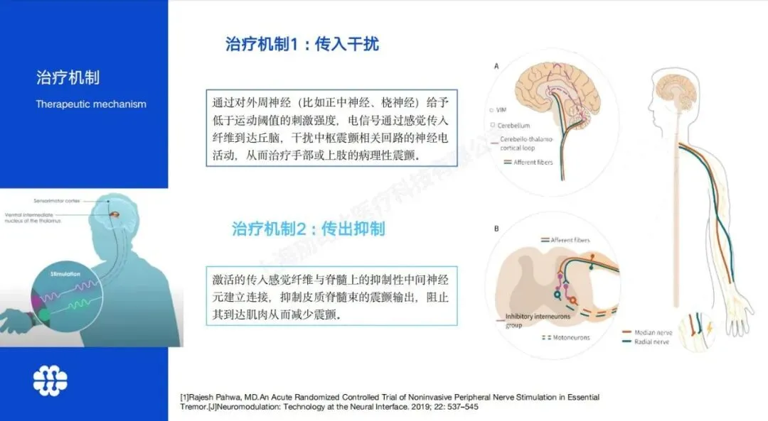 而外周神经调控技术,就是通过手环电极对腕部正中神经和桡神经,发出符合国家安全标准的微弱电信号,一方面向上干扰丘脑的异常放电,从源头打断震颤信号传递;