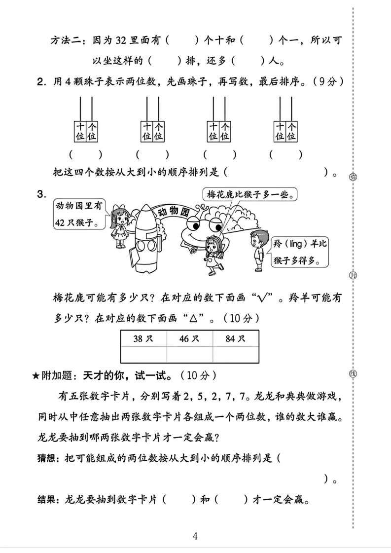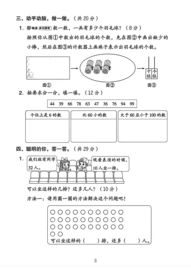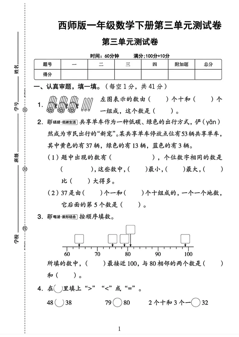 🌸今天给家长分享的是:一年级数学下册《第三单元测试券》|电子版可打印