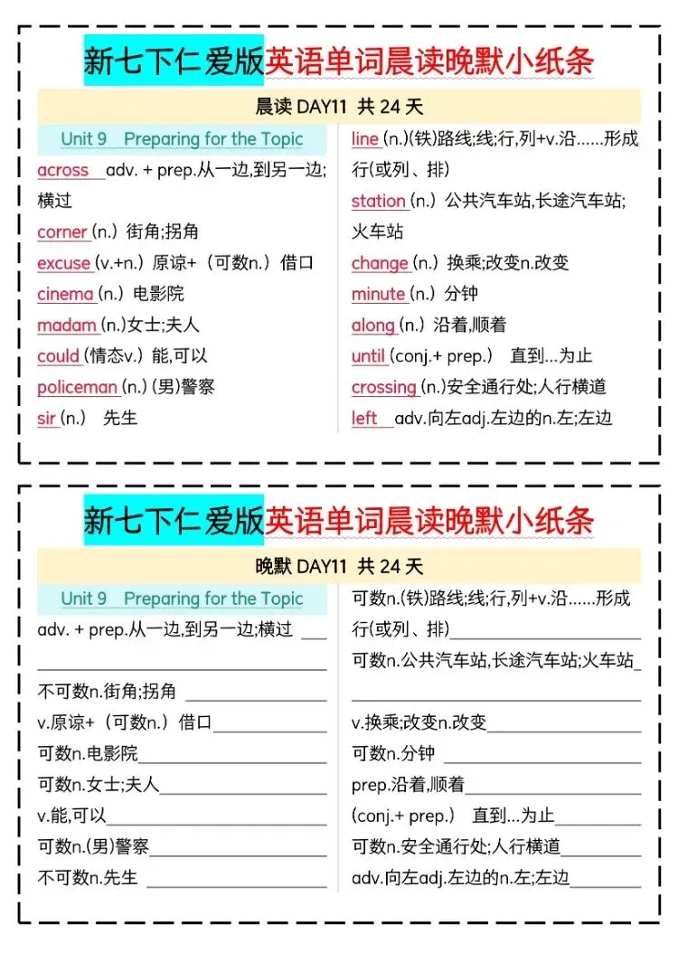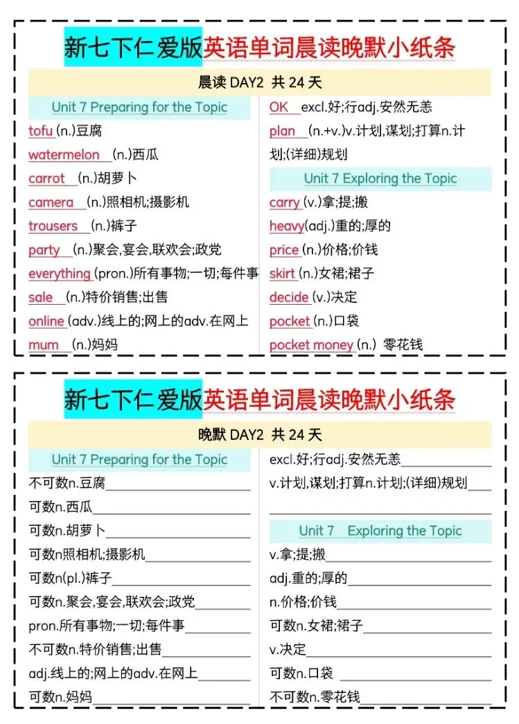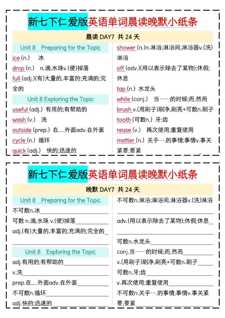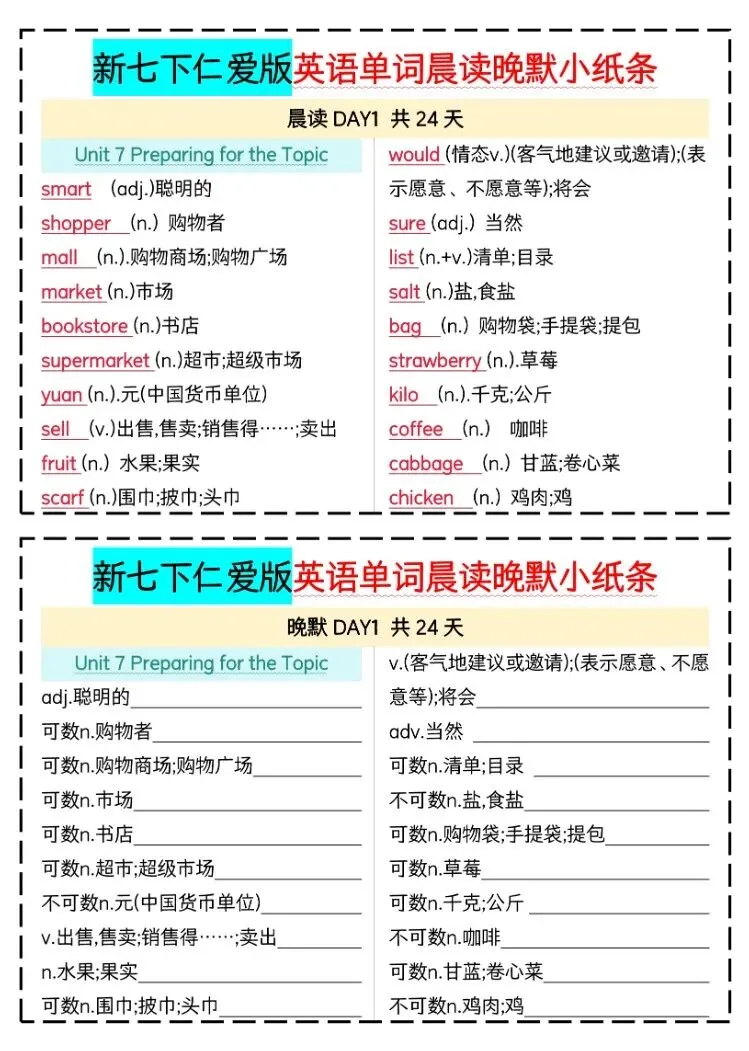 【26年春季学期】七年级下册仁爱版英语重点单词晨读晚默,电子版可下载打印!