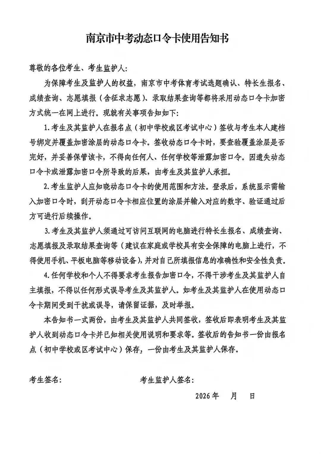 南京市中考动态口令卡使用告知书预计将在近期下发,让家长签字。
