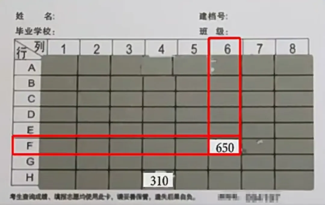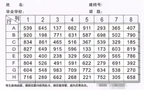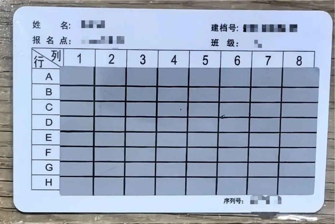 另一面则有学生的姓名、建档号、报名点、班级,以及8*8的方格,每个方格内有3位数字密码,方格上覆盖着可刮开的涂层。