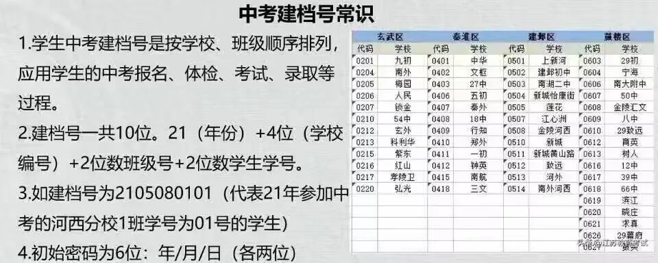 在南京中考中,建档号是考生的唯一身份标识编号。建档号非常重要,现阶段各大高中开始进行信息登记、注册账号的时候就需要用到建档号,另外,后续志愿填报等环节也需要使用。