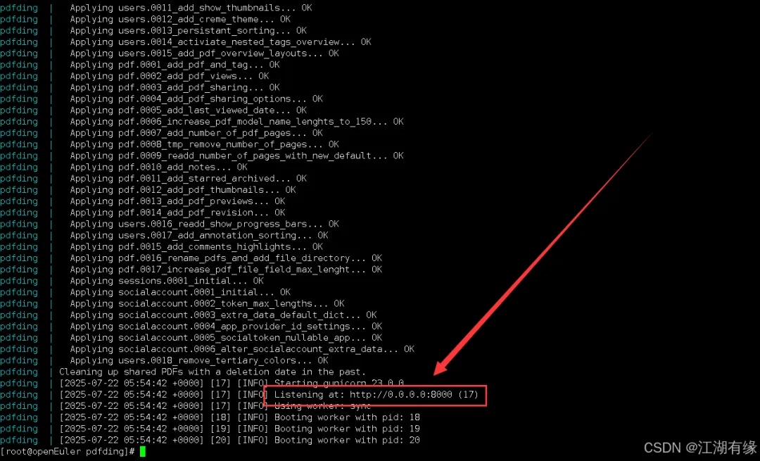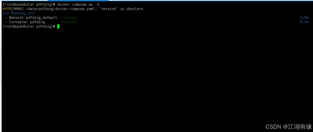 [root@openEuler pdfding]# docker compose psWARN[0000] /data/pdfding/docker-compose.yaml: `version` is obsolete NAME IMAGE COMMAND SERVICE CREATED STATUS PORTS pdfding mrmn/pdfding:v1.3.1 "./bootstrap.sh" pdfding 4 seconds ago Up 3 seconds 0.0.0.0:8000->8000/tcp, :::8000->8000/tcp