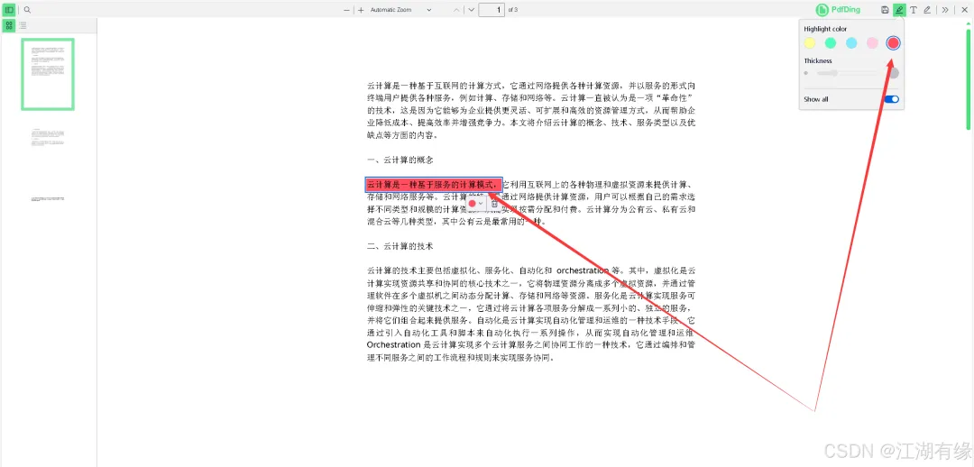 在文档预览页面,我们可以点击“Highlight”图标,选择不同颜色后,对重要句子或段落进行高亮显示。