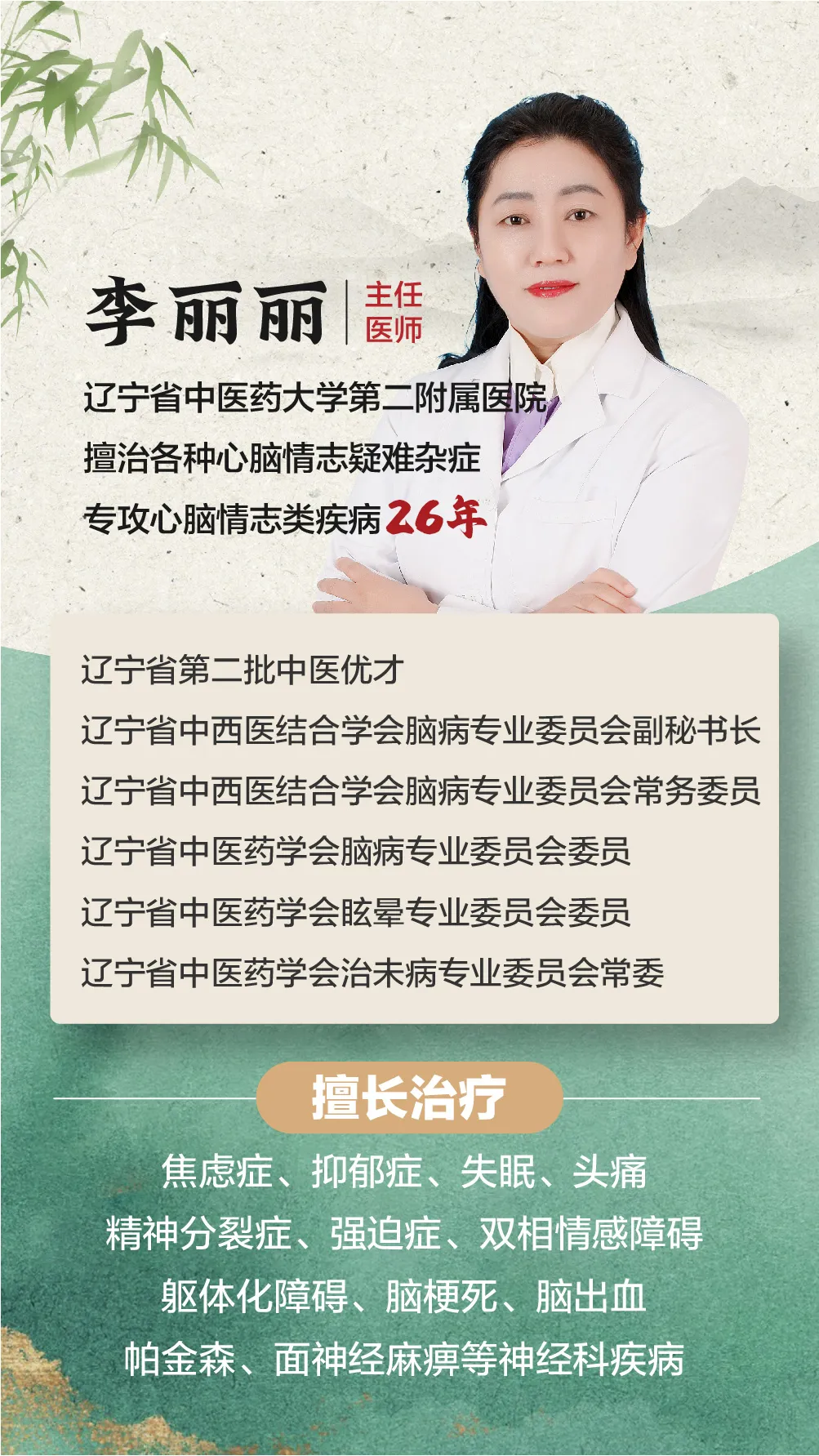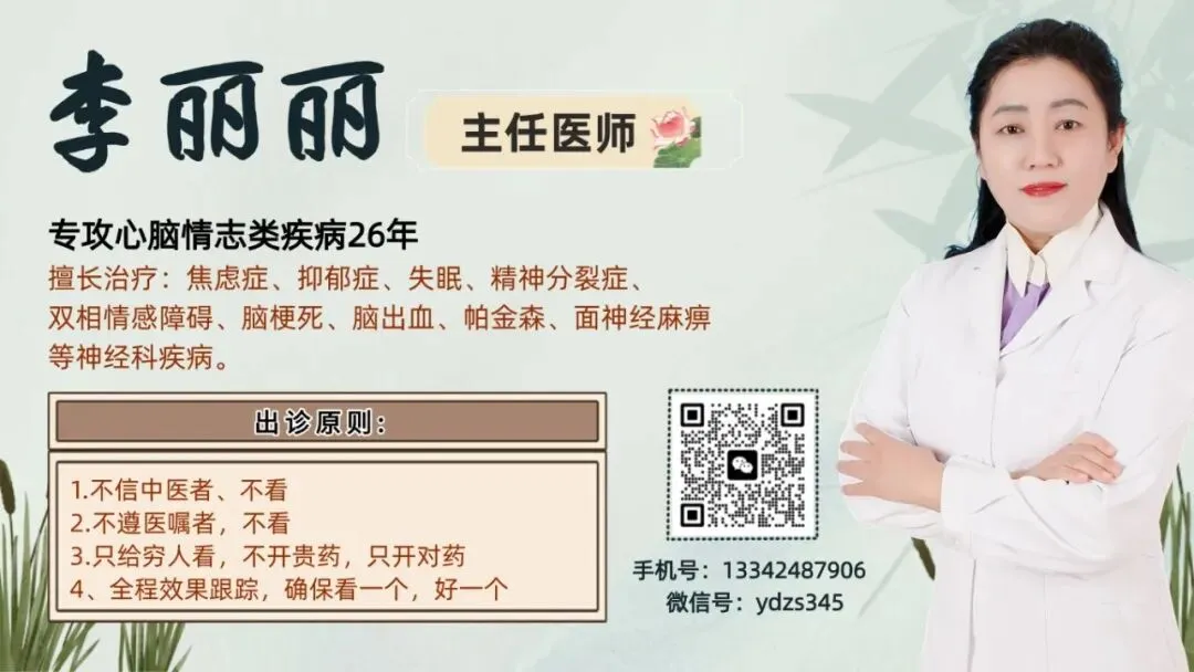 我是中医李丽丽,专攻情志病近30年,始终秉持“大医精诚,大爱无私”的信念,立志让饱受疾病困扰的患者都能重新拥有健康、幸福的生活。