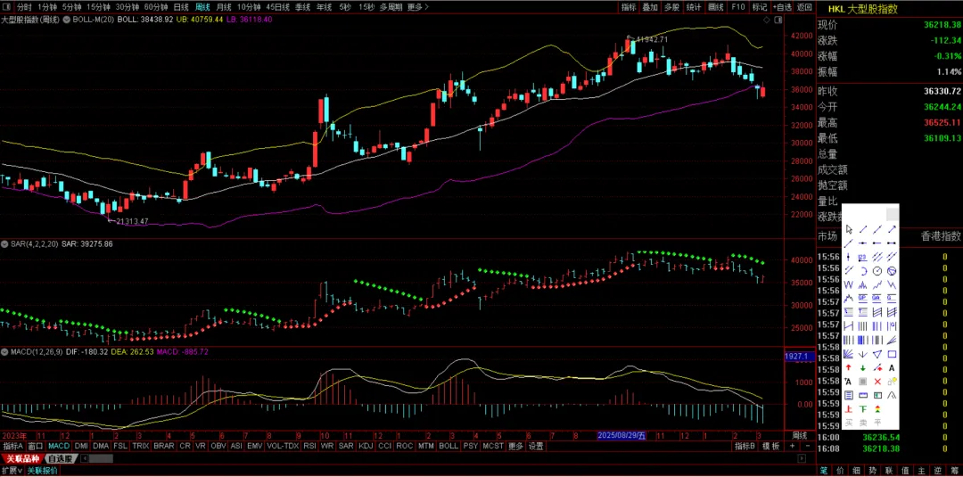 周线尺度,恒生指数完成了对布林线下轨的反抽,下周下行有可能扩大。