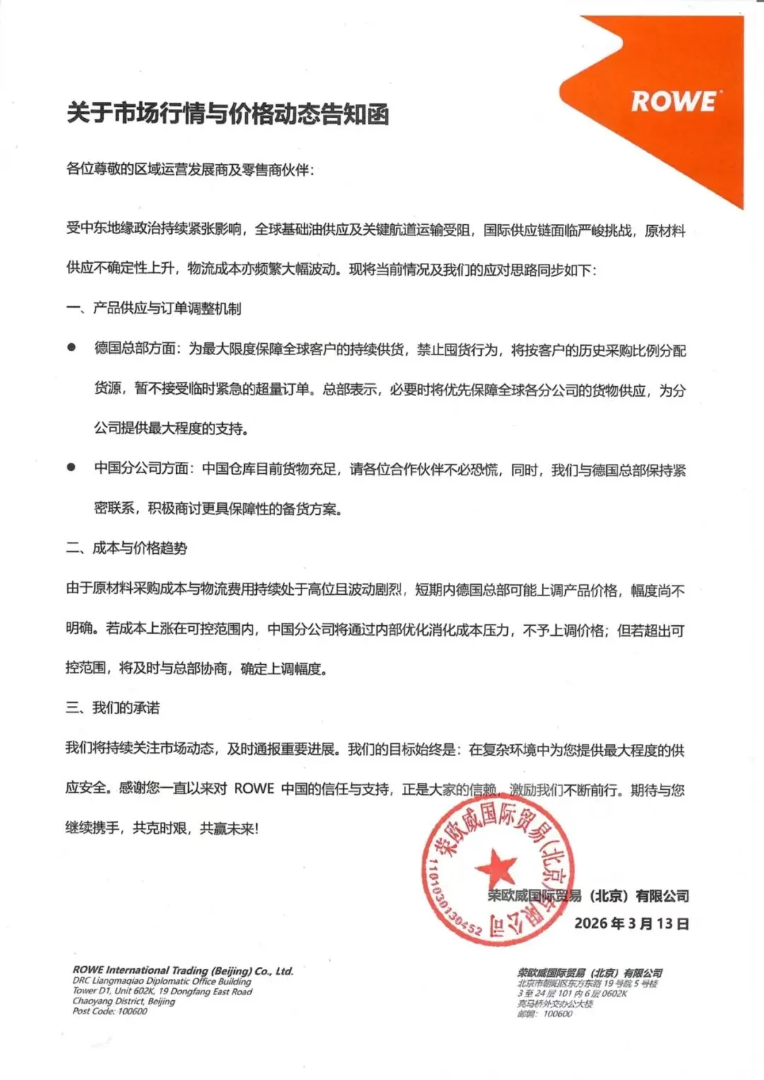 ROWE德威润滑油关于供货与价格波动说明