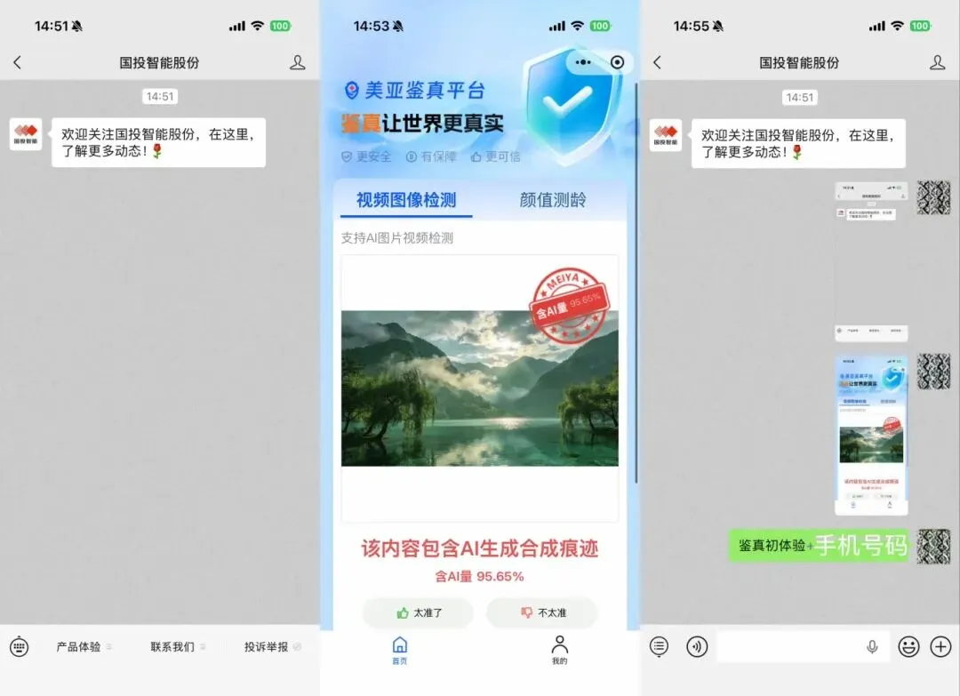 📝任务要求:美亚鉴真小程序最新推出音频检测功能!关注国投智能股份微信公众号后,通过后台菜单进入产品体验-美亚鉴真小程序,完成1次AI生成内容(图片/视频/音频)鉴真检测,将「公众号关注截图+检测结果截图」发送至公众号后台,并备注【鉴真初体验+手机号】