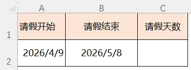 题目:请在C2单元格输入公式,计算请假天数。