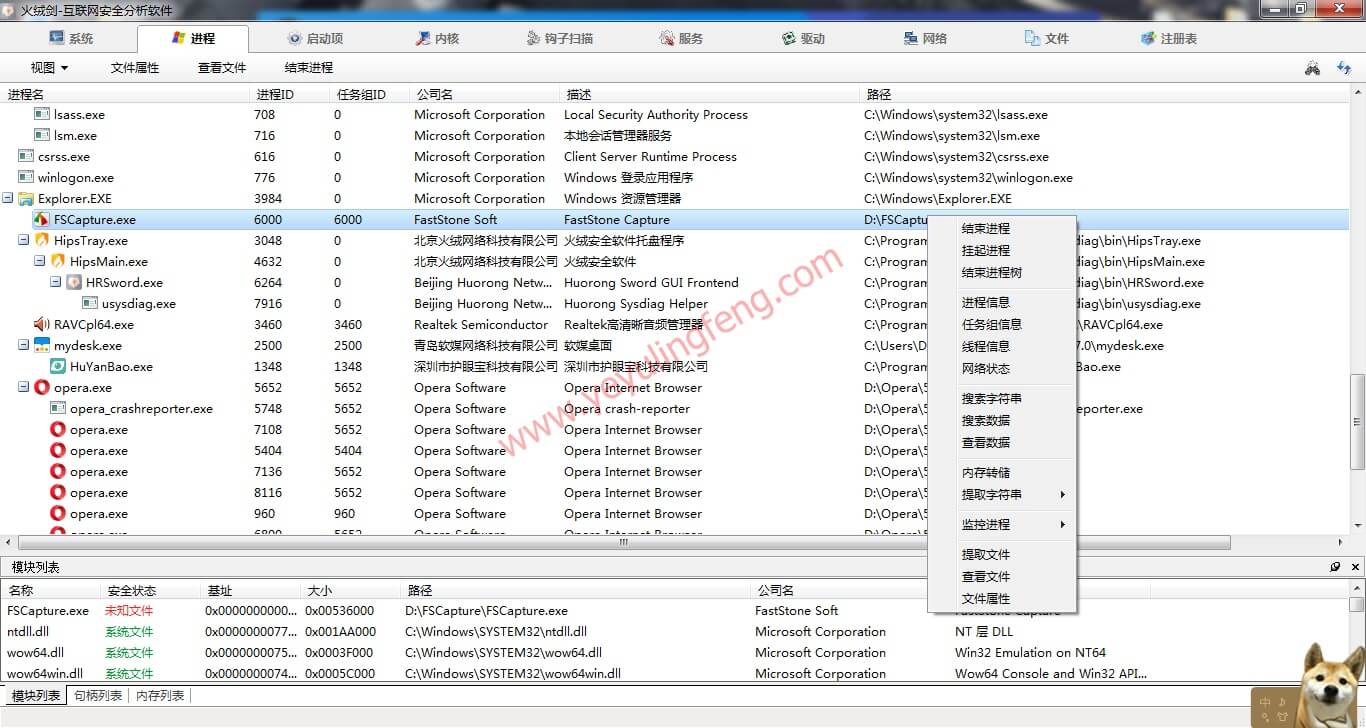 4、可以快速识别进程行为,并依靠追踪调用栈进一步了解进程逻辑。查看进行模块、内存转储和提取内存字符串,更加具体的获得进程的运行信息;