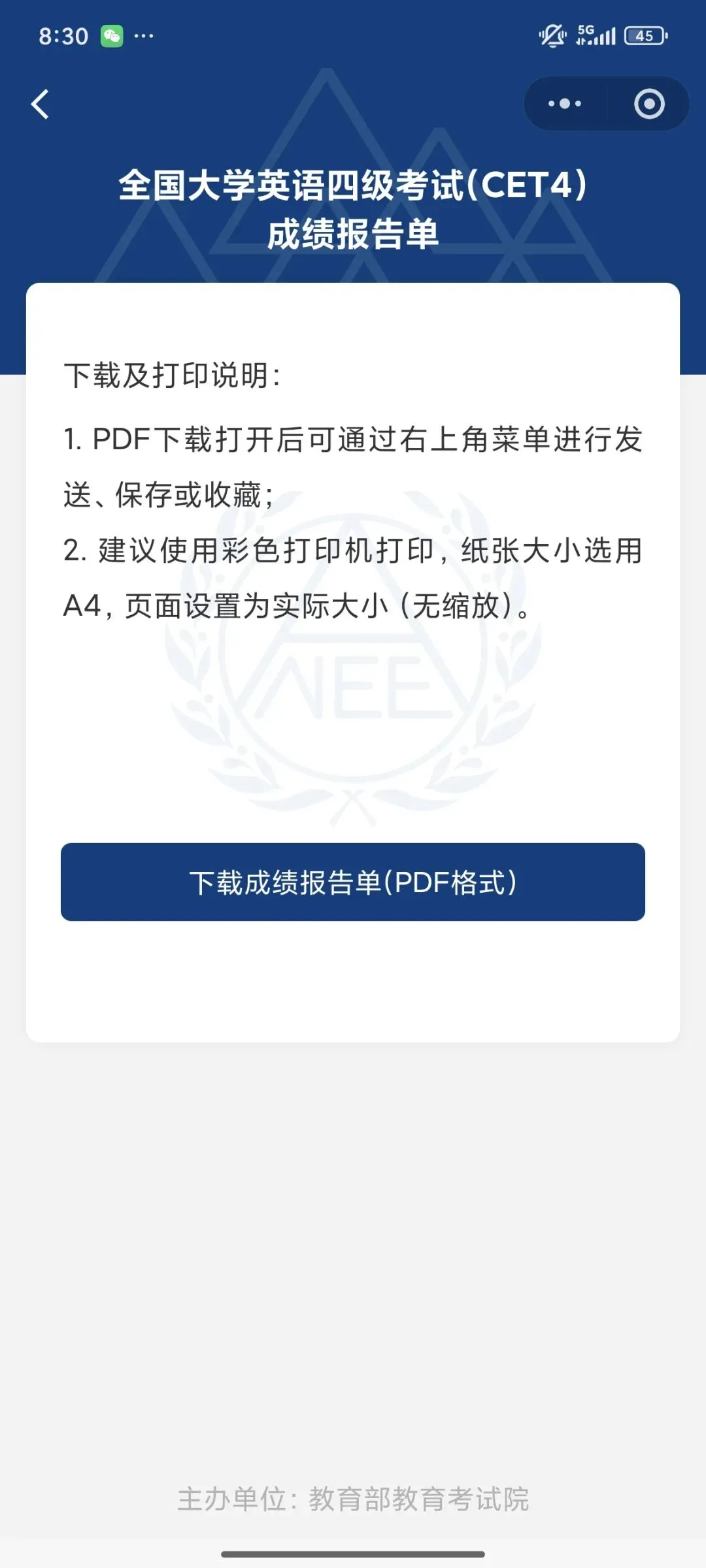 下载方法:登录中国教育考试网→大学四六级考试→登录→查询