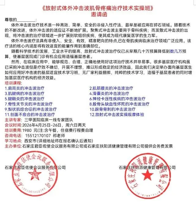 体外冲击波治疗的临床价值已得到广泛验证,但规范化操作与精准评估是疗效保障的关键。为帮助各位同道全面提升技术水平,我们特举办体外冲击波规范化诊疗学习班,特邀领域专家授课,内容涵盖: