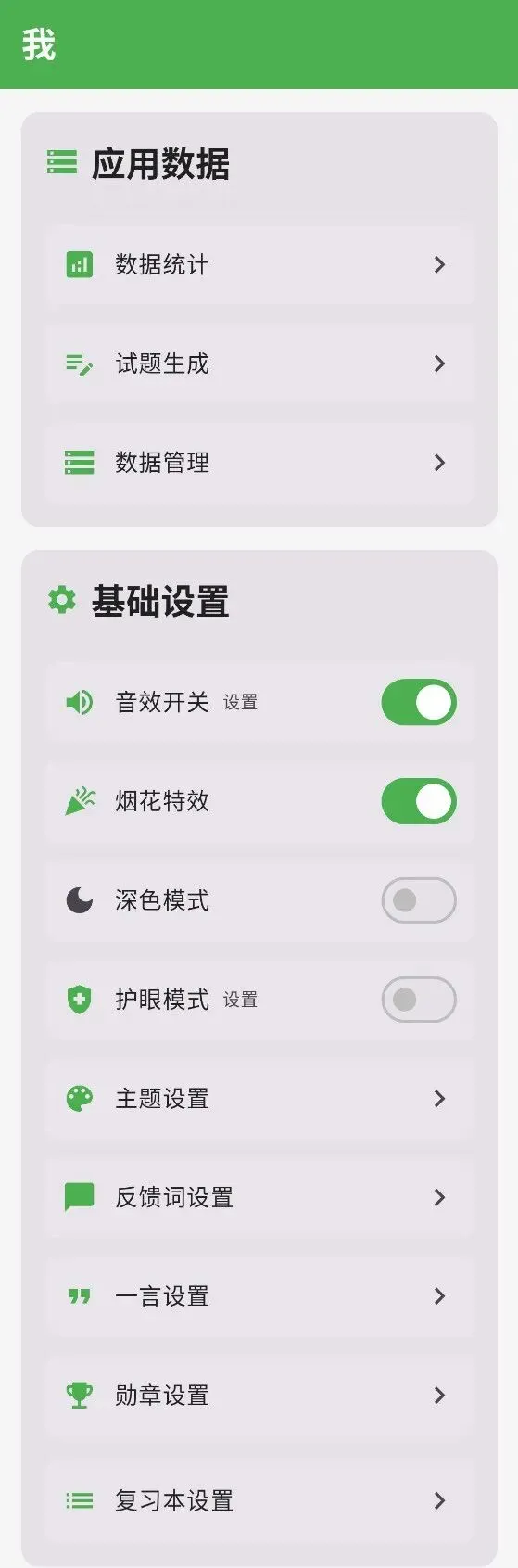 在软件【我】的页面里面有很多功能设置。如果不想让孩子在手机上练习,也可以用【试题生成】功能,生成电子文件,再打印出来