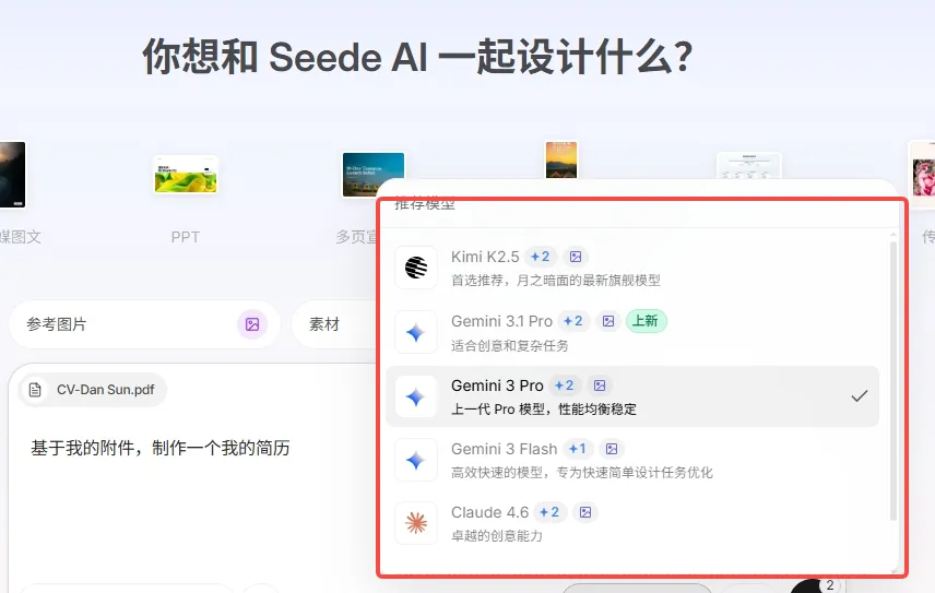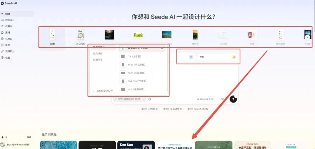 Seede AI输入功能划分很细,可以上传参考图、素材、文档,也可以根据不同物料选择对应尺寸和模板。