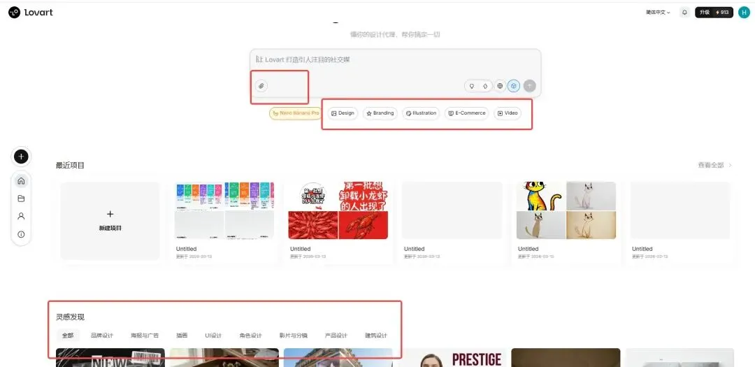 Lovart没有区分上传的附件,尺寸在画布中选择或者直接套用别人的模板(灵感)。