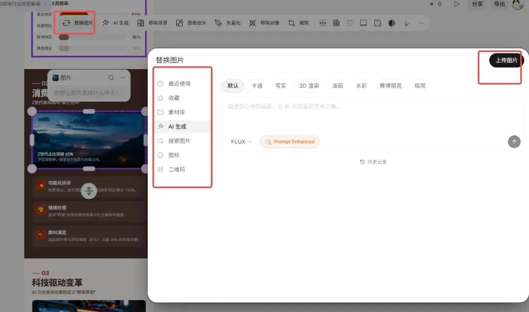 Seede AI也提供图片素材,当你不满意某张图片又懒得本地上传时,你可以选中它再选择“替换图片”,从它的素材库中查找,也可以AI生成替换原有图片。