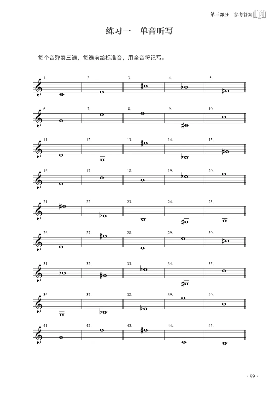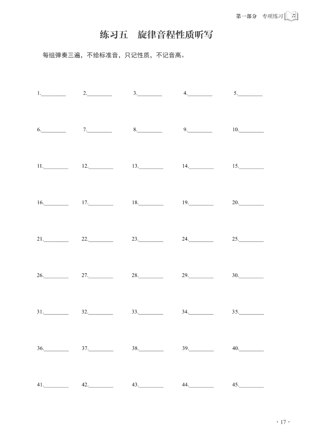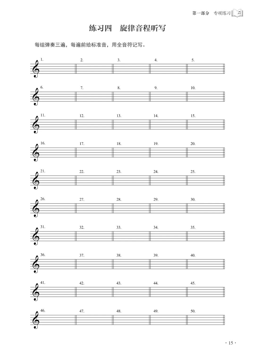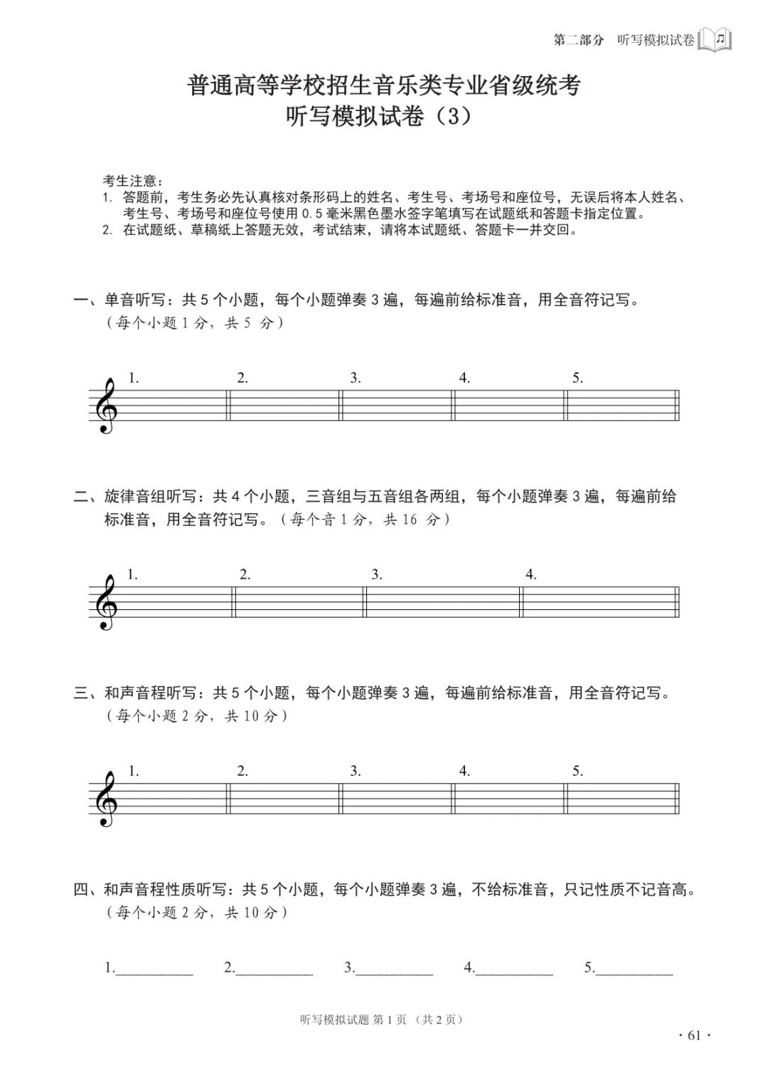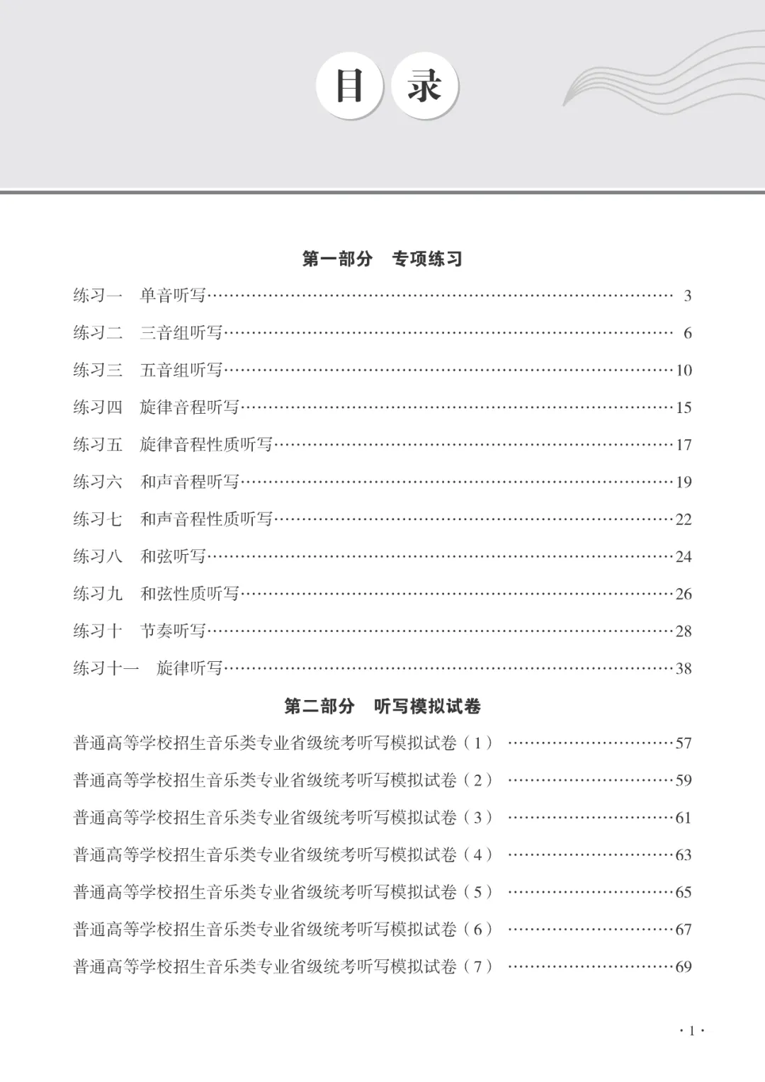 第一部分为专项练习,涵盖单音听写、三音组听写、五音组听写、旋律音程听写、旋律音程性质听写、和声音程听写、和声音程性质听写、和弦听写、和弦性质听写、节奏听写、旋律听写,为考生提供专业、系统的专项训练。每项训练的试题均为精心安排,布局科学合理,能够使考生在有趣的训练中循序渐进、稳步提升。