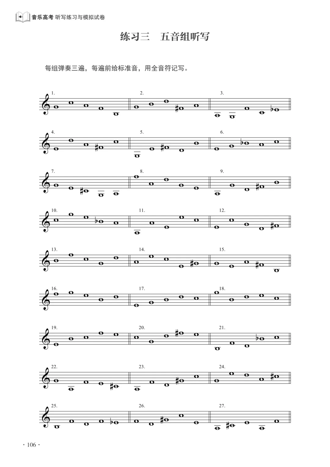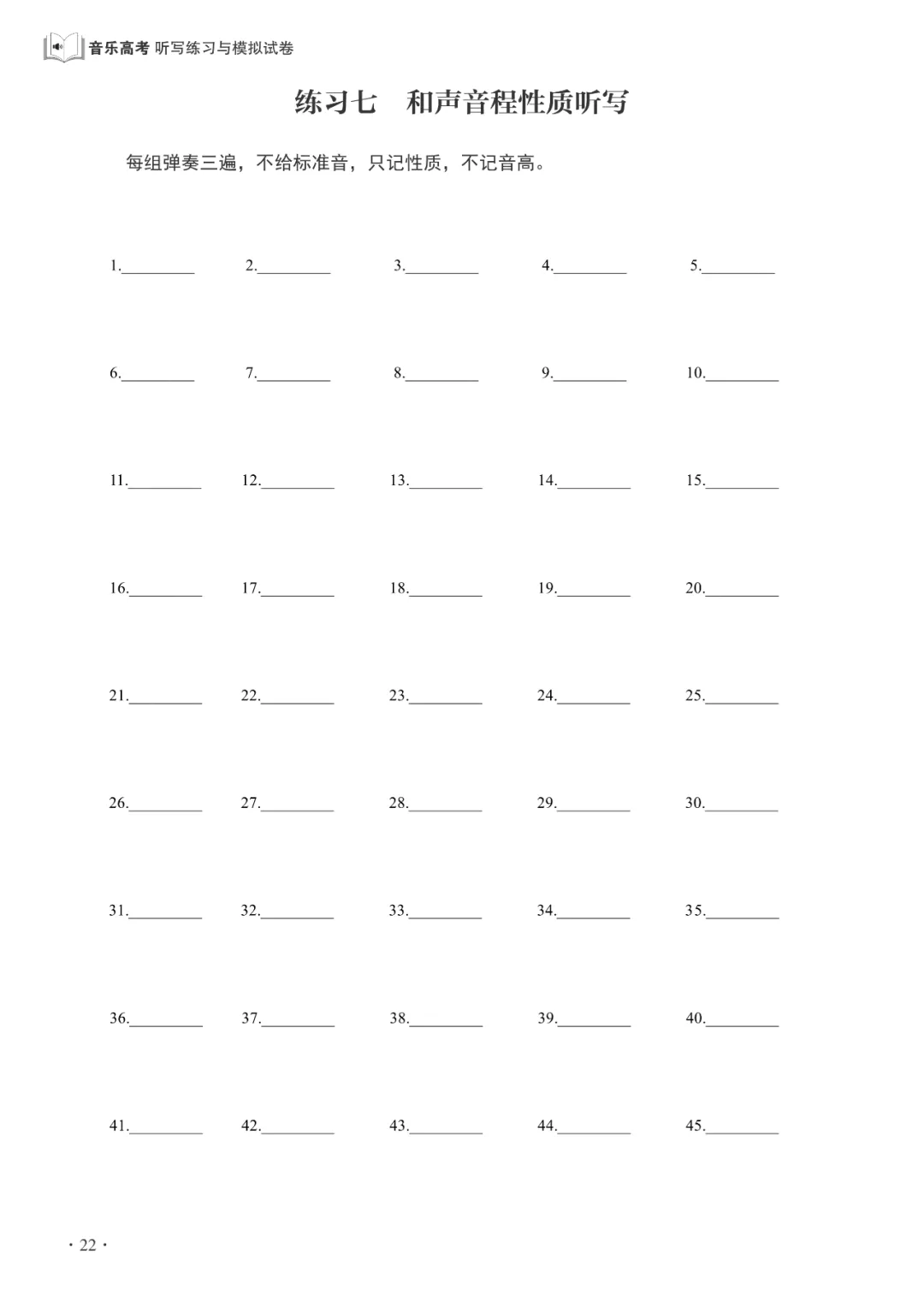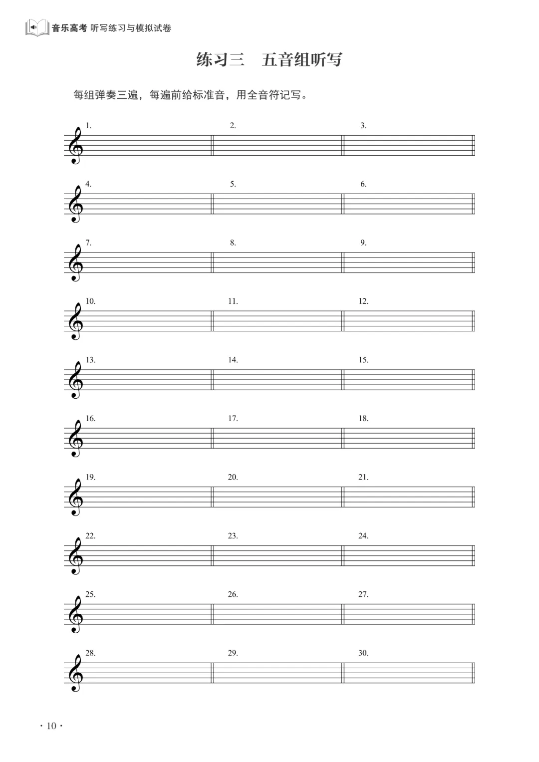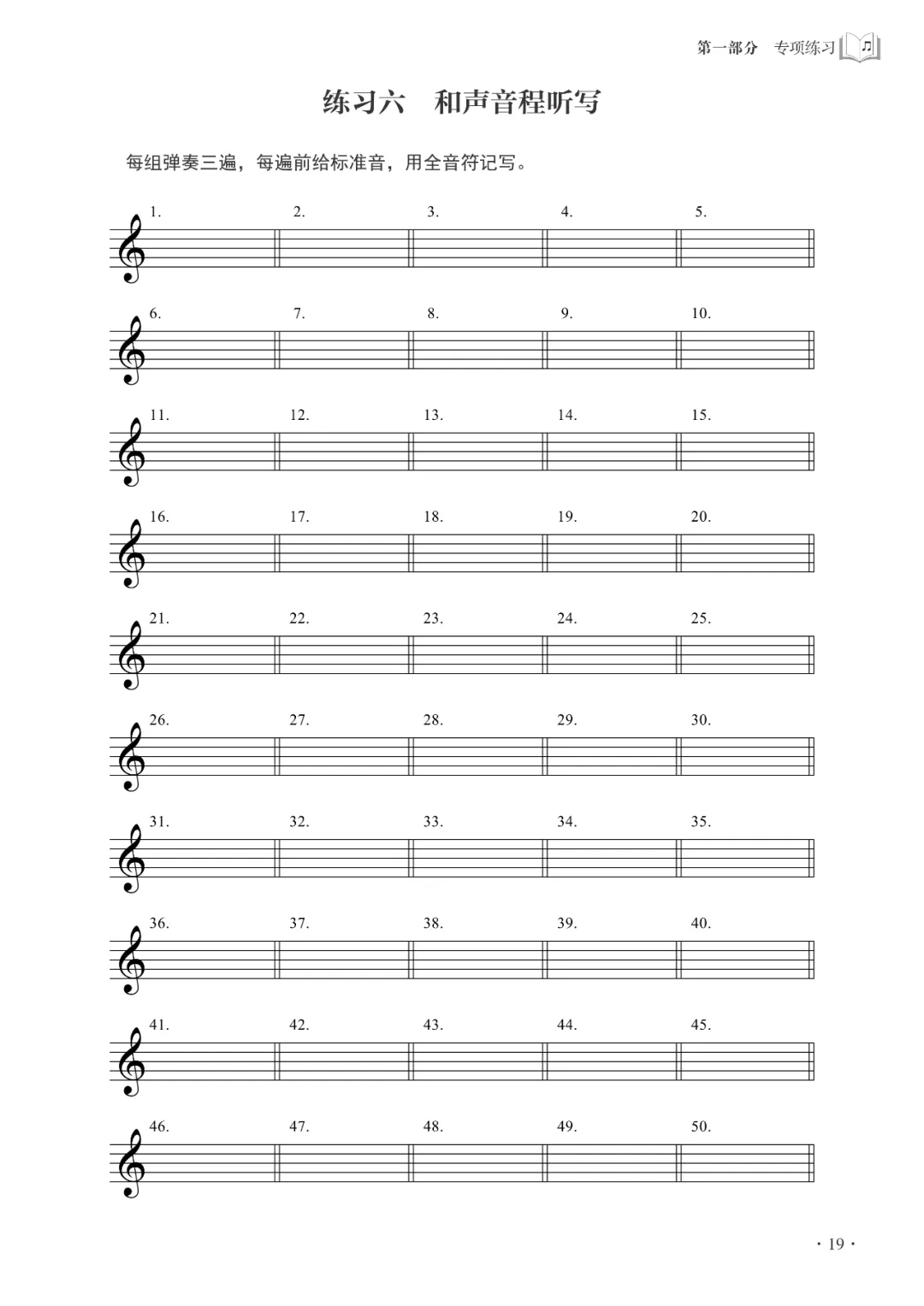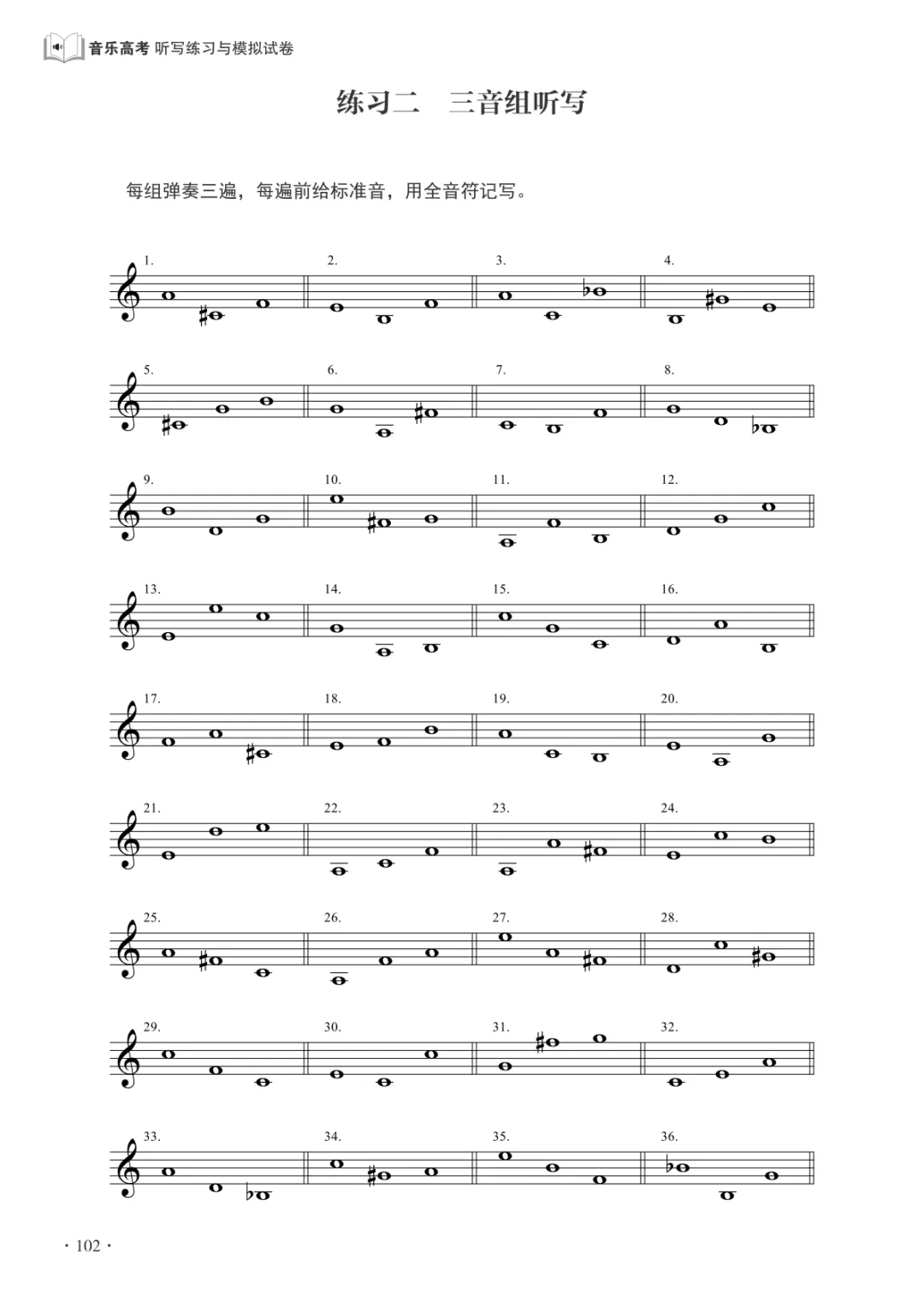 第一部分为专项练习,涵盖单音听写、三音组听写、五音组听写、旋律音程听写、旋律音程性质听写、和声音程听写、和声音程性质听写、和弦听写、和弦性质听写、节奏听写、旋律听写,为考生提供专业、系统的专项训练。每项训练的试题均为精心安排,布局科学合理,能够使考生在有趣的训练中循序渐进、稳步提升。