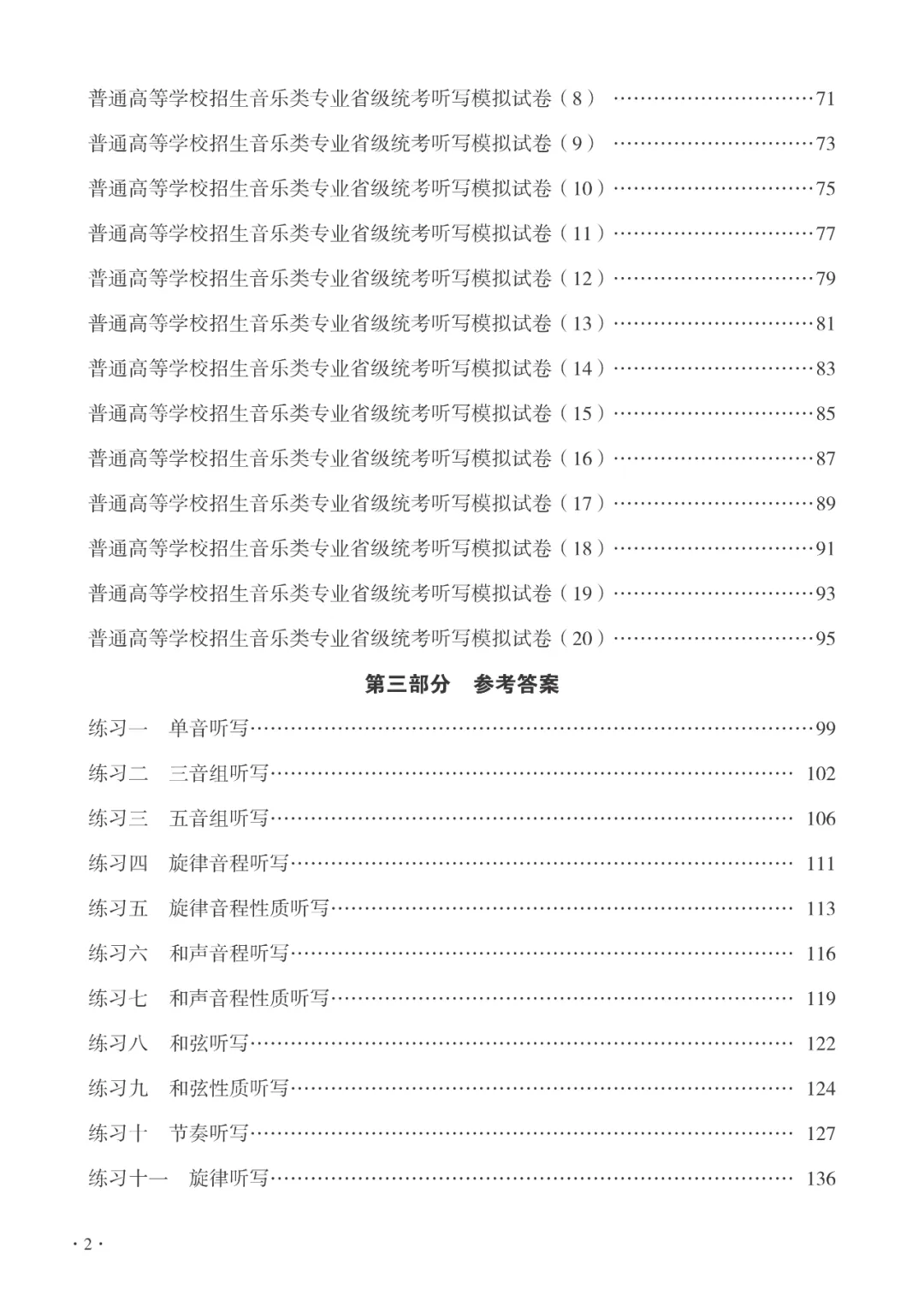 第二部分为二十套音乐高考听写模拟试卷,试卷具有很强的针对性,其内容、题型、难易程度均与现行考试大纲要求一致,为广大考生备考提供了方向指引。