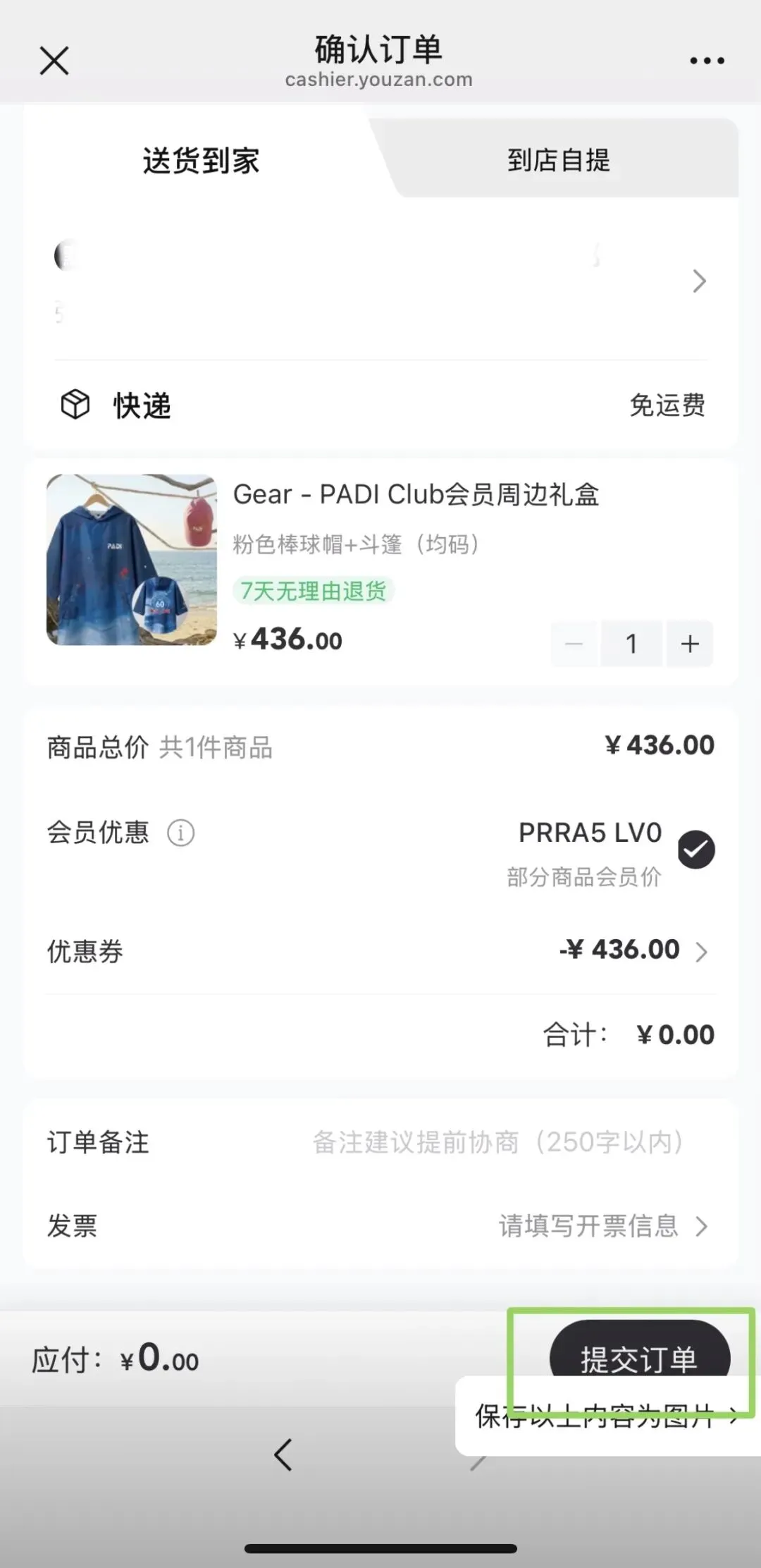 PADI 在线电子卡 – Club会员 – 畅享周边会员 – 立即开通 – 回到畅享周边会员详情页 – 点击Banner领取商品兑换券 – 系统自动跳转进入有赞商品详情页 – 点击立即购买 – 填写地址后0元提交订单即可