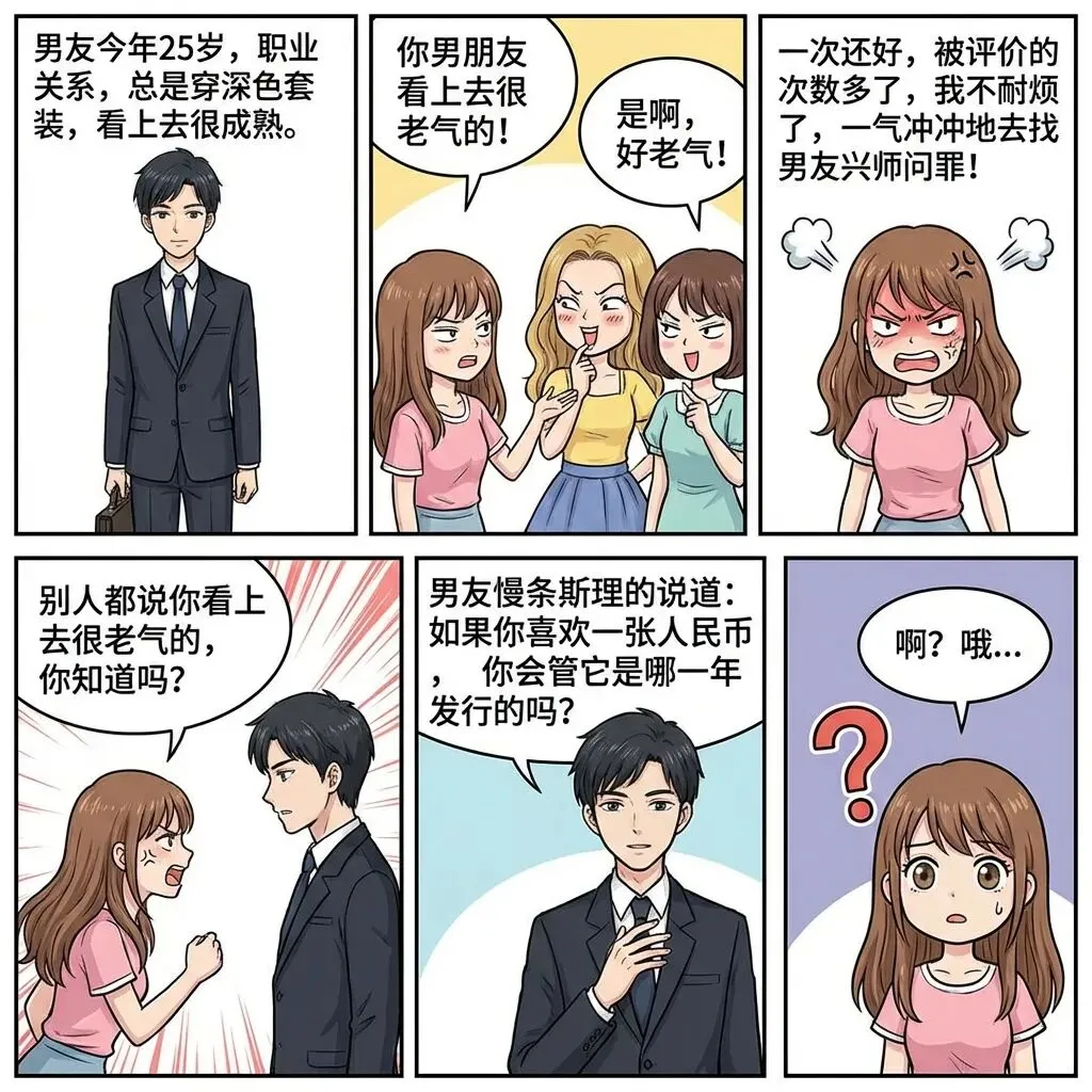 搞笑漫画:男朋友25岁,穿深色套装,女友都嫌弃他很老气.男友实力反驳