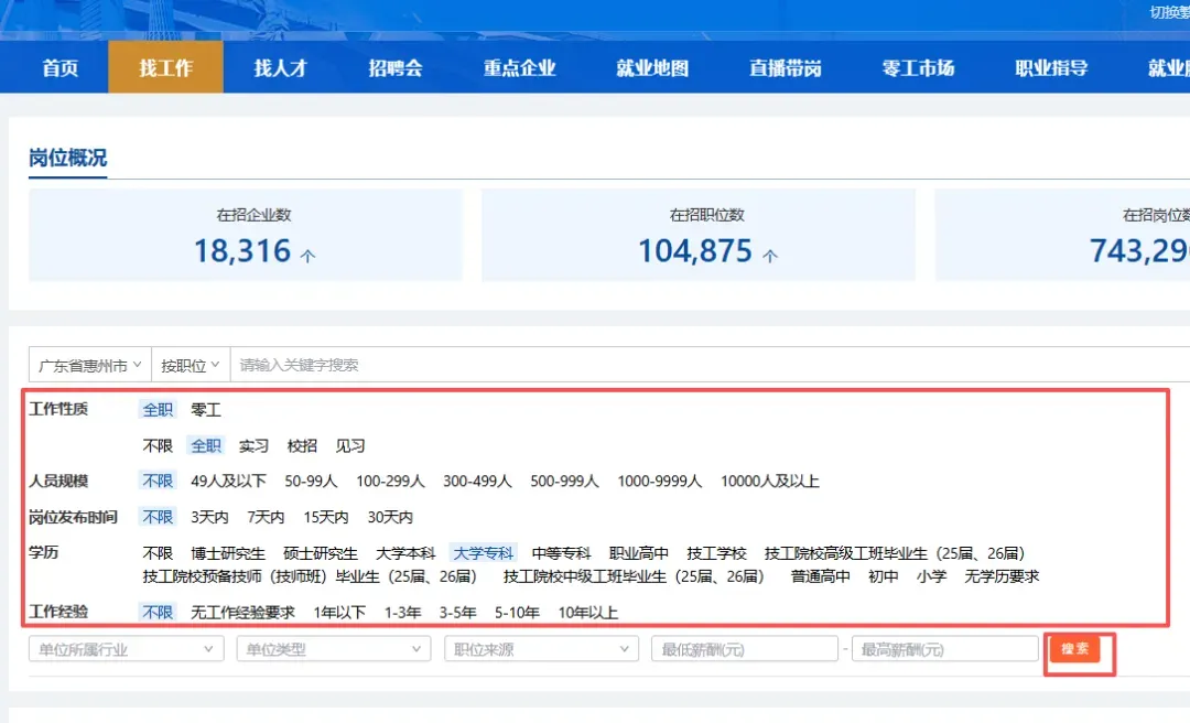 条件筛选:可以通过“工作地点”、“学历”、“工作经验”等条件进行筛选,精准找到最适合你的职位。