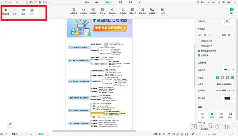 操作上,万兴脑图也走的是“上手快但功能深”的路线。界面干净,按钮不多,但点进去你会发现各种细节都考虑到了:节点可以自由拖拽、颜色随心换、图标能自定义,还能一键切换成大纲模式,方便快速梳理层级。更贴心的是,它还支持把脑图直接转成PPT或者看板视图,开会汇报、课堂展示都不用再折腾格式转换,点几下就搞定。