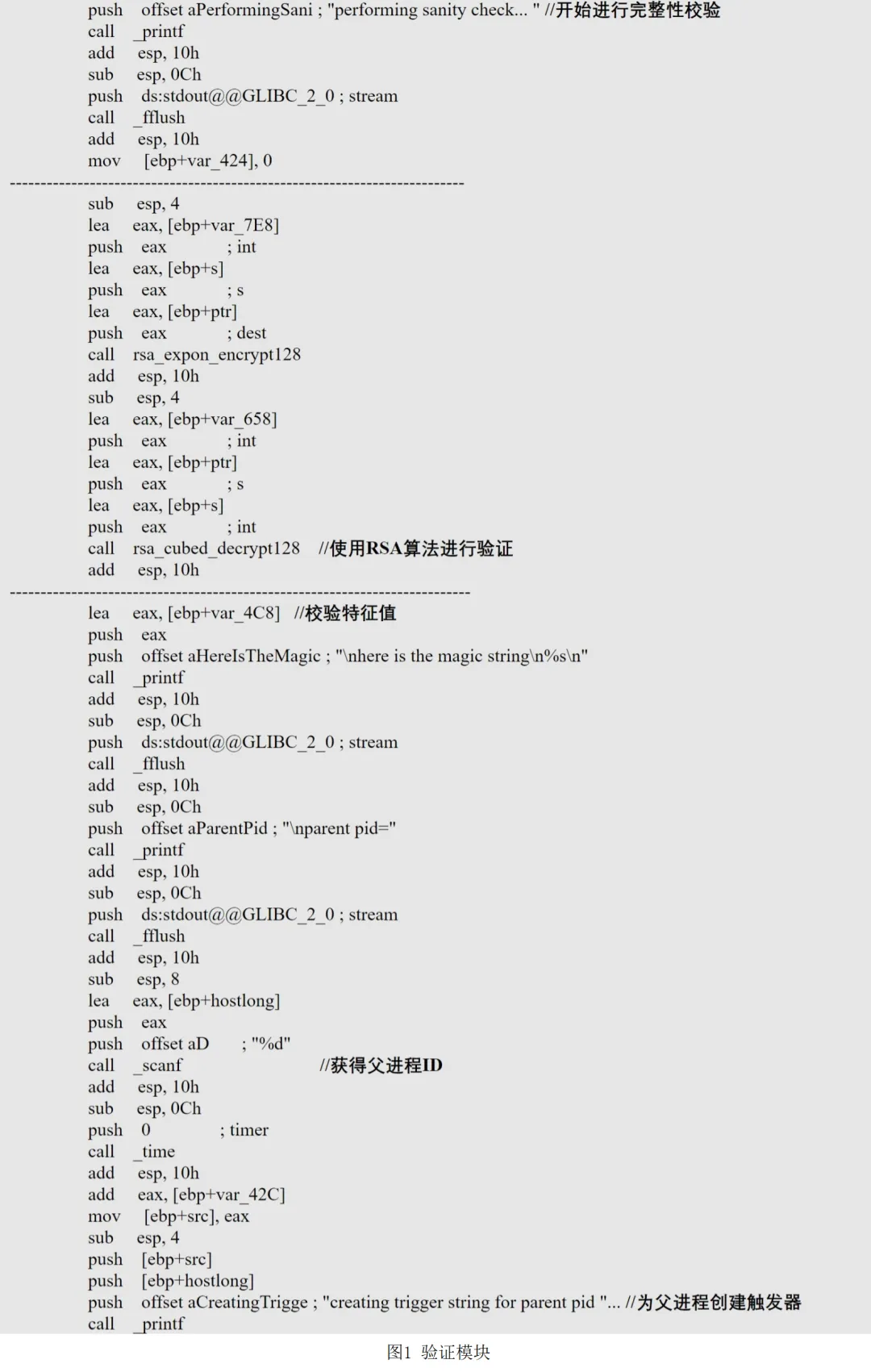 验证模块的主要功能是在“饮茶”被调用前验证其调用者(父进程)的身份,随后进行解密、解码以加载其他恶意软件模块。如图1所示。