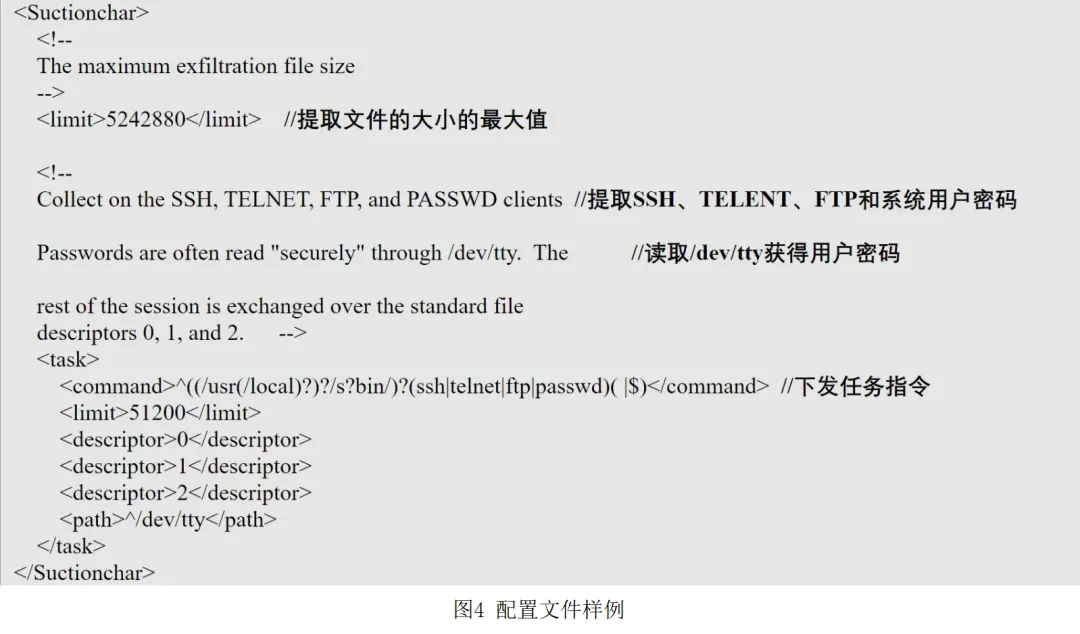 经技术分析与研判,该网络武器针对Unix/Linux平台,与其他网络武器配合,攻击者可通过推送配置文件的方式控制该恶意软件执行特定窃密任务,该网络武器的主要目标是获取用户输入的各种用户名密码,包括SSH、TELNET、FTP和其他远程服务登录密码,也可根据配置窃取保存在其他位置的用户名密码信息。