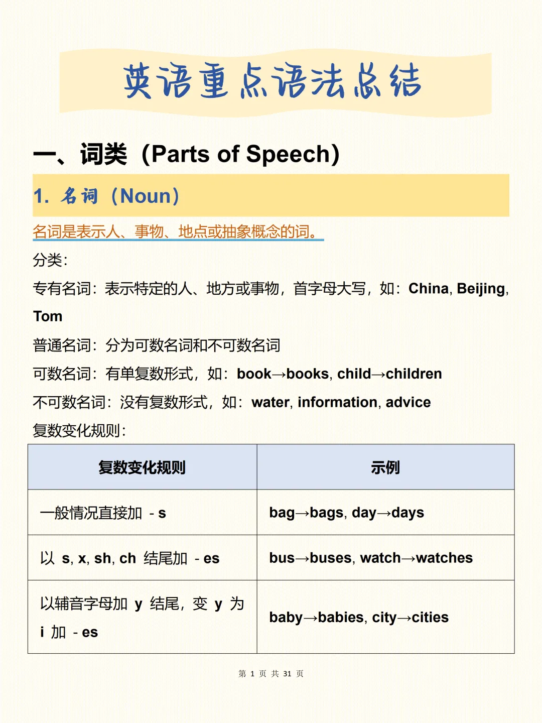 今天给大家整理了中考必备的【英语重点语法总结】,覆盖名词、代词、副词、动词、冠词等全场景常考话题,附详细技巧与实例,不管题目如何变式,都能精准应对,轻松拿下高分!