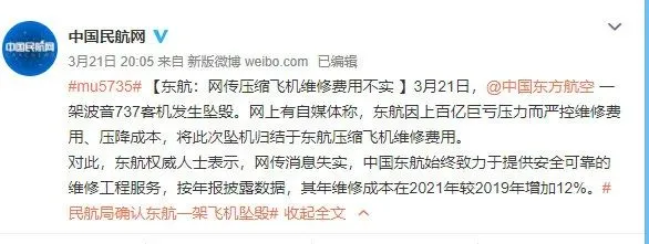网上有自媒体称,东航因上百亿元巨亏压力而严控维修费用、压降成本,将此次坠机归结于东航压缩飞机维修费用。对此,东航权威人士表示,网传消息失实,中国东航始终致力于提供安全可靠的维修工程服务,按年报披露数据,其年维修成本在2021年较2019年增加12%。