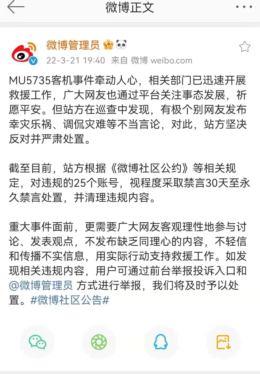 MU5735客机事件牵动人心,@微博管理员 21日发文称,站方在巡查中发现,有极个别网友发布幸灾乐祸、调侃灾难等不当言论,对此,站方坚决反对并严肃处置。截至目前,站方根据《微博社区公约》等相关规定,对违规的25个账号,视程度采取禁言30天至永久禁言处置,并清理违规内容。