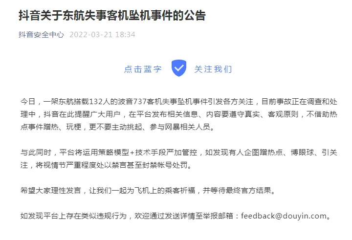 抖音安全中心微信公众号21日发布公告:一架东航搭载132人的波音737客机失事坠机事件引发各方关注,目前事故正在调查和处理中,抖音在此提醒广大用户,在平台发布相关信息、内容要遵守真实、客观原则,不借助热点事件蹭热、玩梗,更不要主动挑起、参与网暴相关人员。与此同时,平台将运用策略模型+技术手段严加管控,如发现有人企图蹭热点、博眼球、引关注,将视情节严重程度处以禁言甚至封禁帐号处罚。
