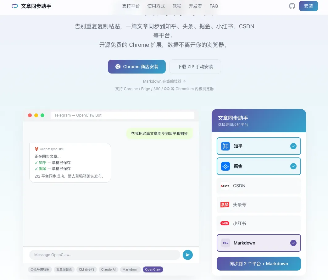 • 🤖 AI集成:通过Anthropic MCP协议,在OpenClaw / Claude Desktop中说一句“把这篇文章同步到知乎和掘金”,自动完成! -